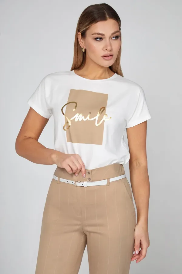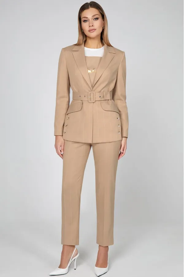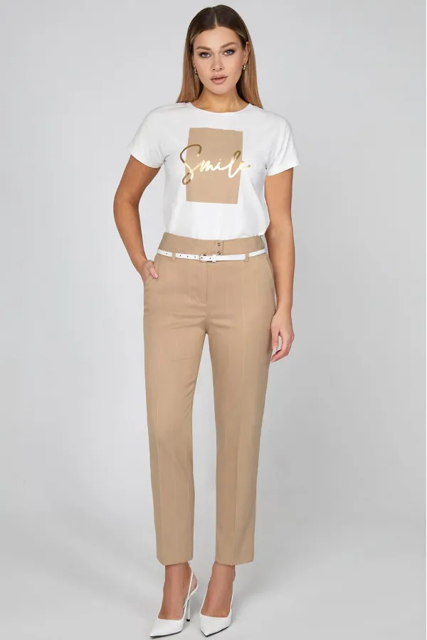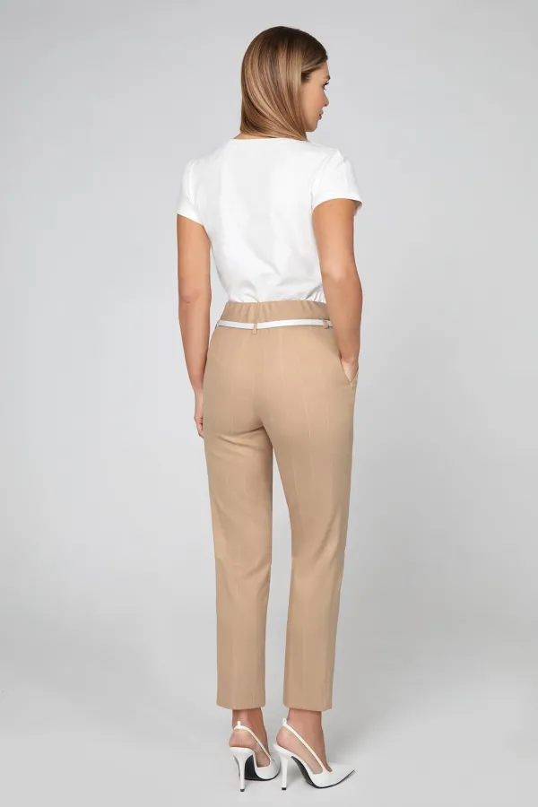 Стильные брюки со стрелками, с посадкой на талии. Модель выполнена из приятной ткани в полоску с добавлением вискозы. Изделие на притачном поясе, частично собранном на эластичную тесьму, застёжкой на молнию и петли-пуговицы и косыми карманами по переду. Короткие шлёвки позволяют дополнить брюки узким ремнём. В пару к изделию можно подобрать жакет из той же линейки для создания готового комплекта.