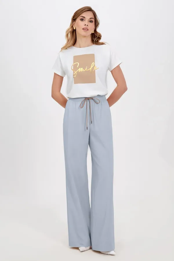 Брюки однотон Эта модель из смесовой ткани на основе льна идеально подходит для лета. Широкий крой и удлинённые штанины придают образу непринуждённый вид. Боковые карманы и эластичный пояс со шнуром дополняют комфортный ... Читать далее...