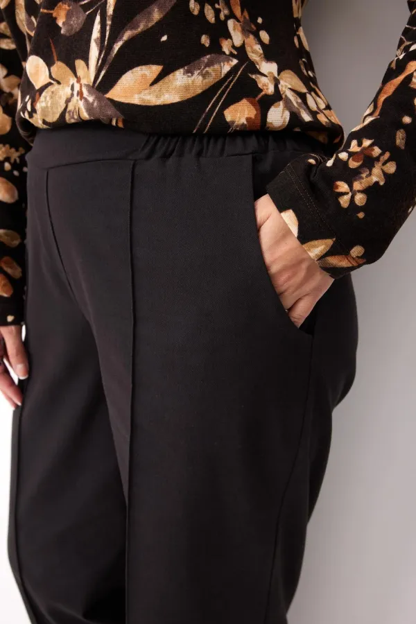 По передней части брючин застрочены стрелочки для визуального удлинения ног.