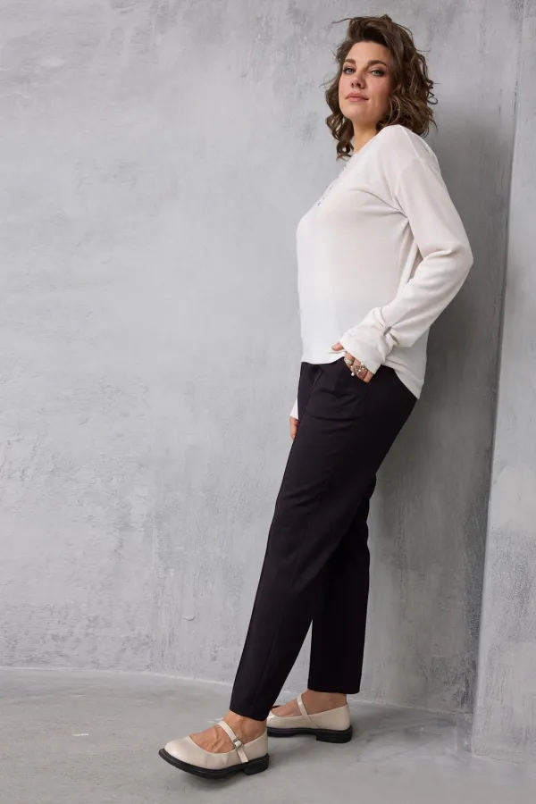 Пояс притачной, на эластичной резинке. По передней части на поясе выполнен «островок», что позволяет визуально скрыть животик. Для Вашего удобства выполнены карманы хулиганы. В боковых швах карманы «Хулиганы». Притачная кокетка по задней части, позволяет грамотно создавать нужные линии, что делает посадку брюк идеальной. Низ брюк обработан классическим способом в подгибку.