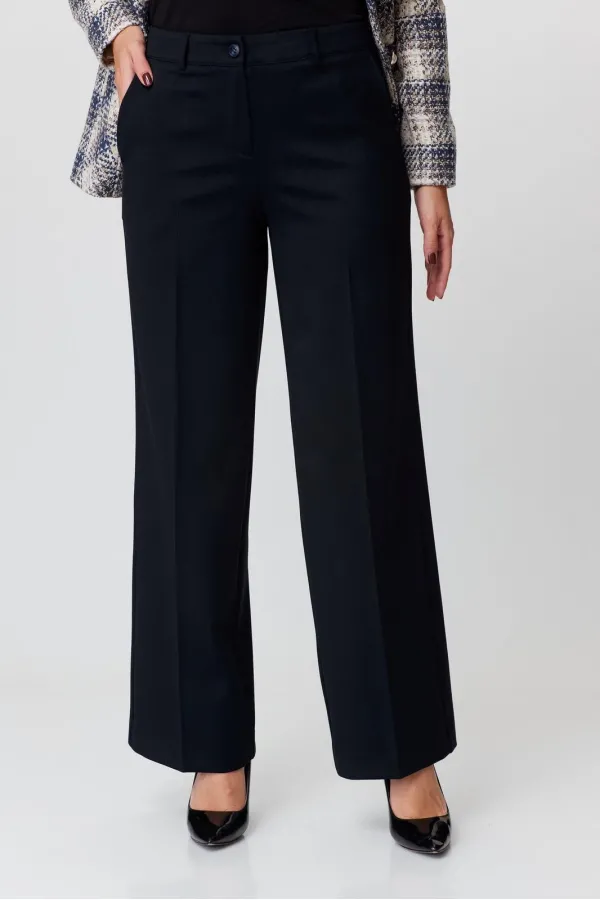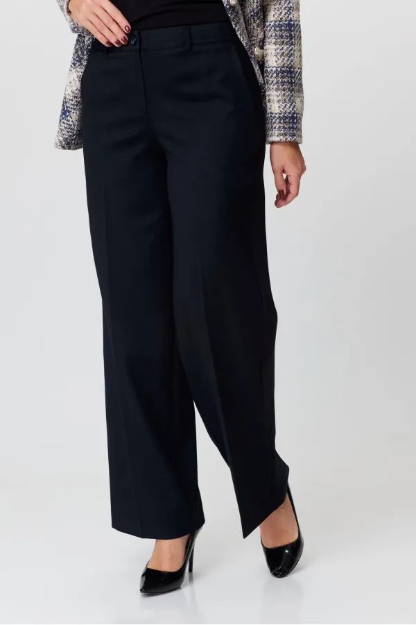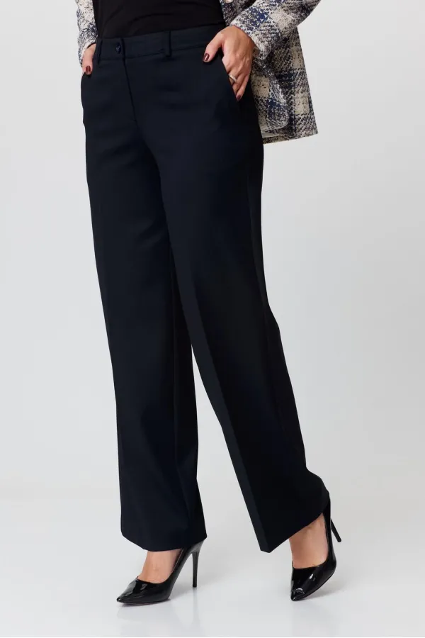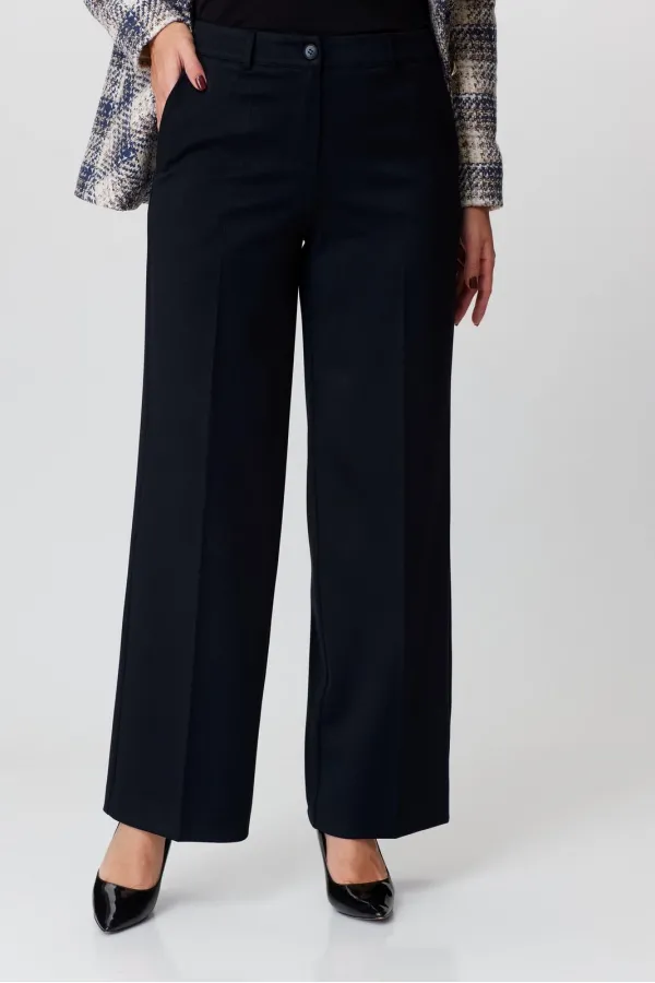 Брюки-палаццо, на сезон осень-зима, средней ширины,из плотной текстильной ткани, выполнены с карманами с отрезным бочком в боковом шве. Пояс притачной, застёжка на молнию. По задним половинкам обработаны вытачки. Длина по боковому шву 108 см.