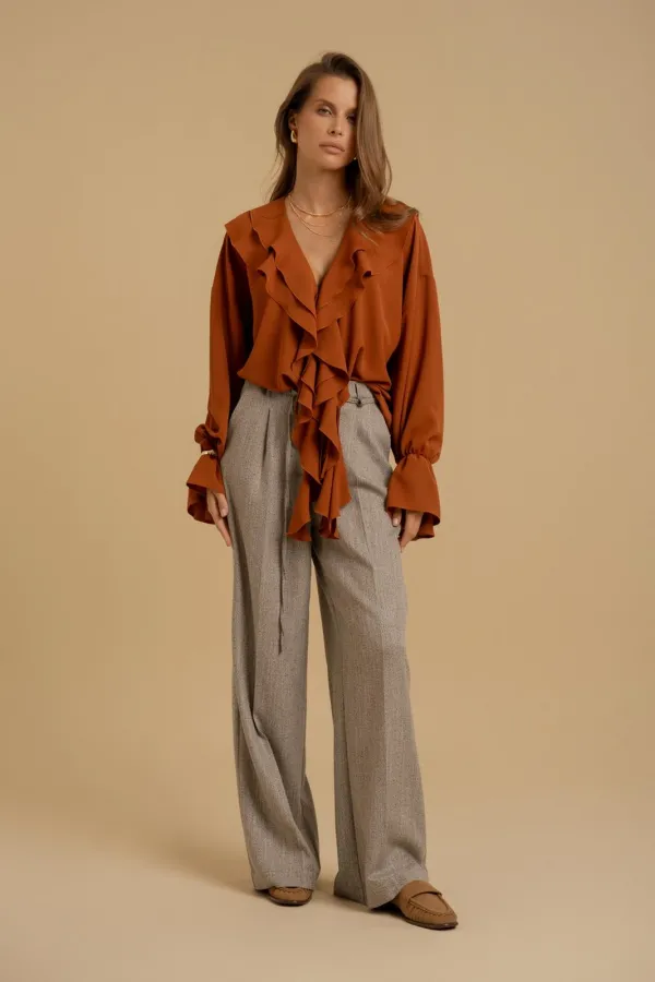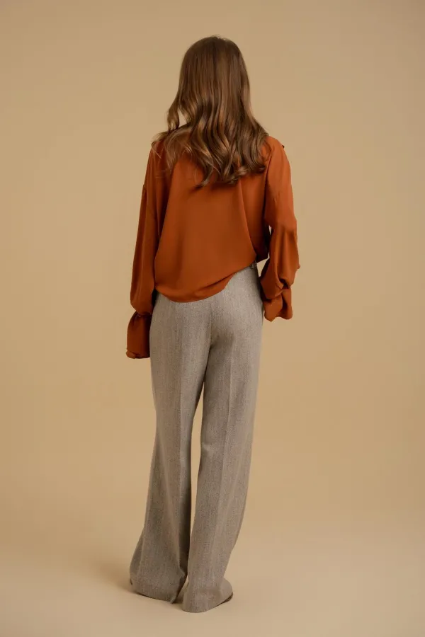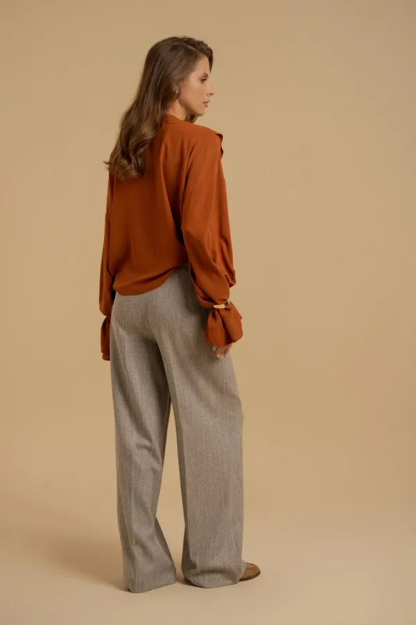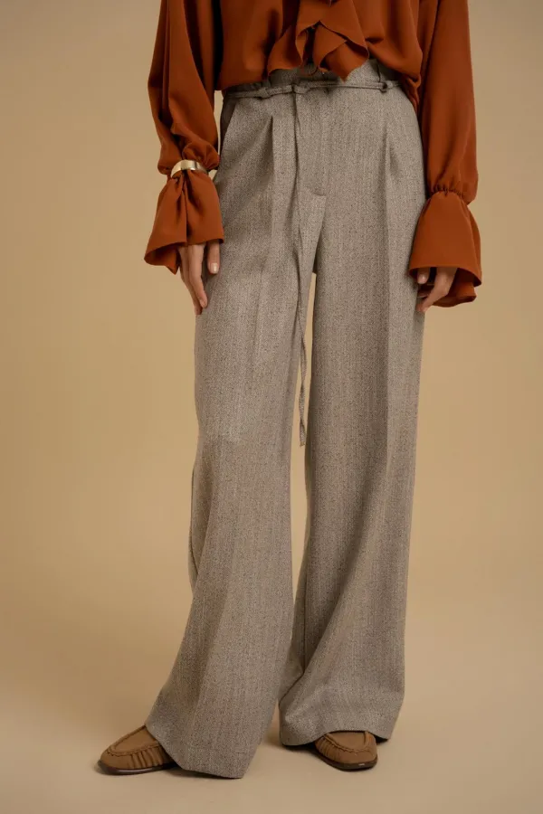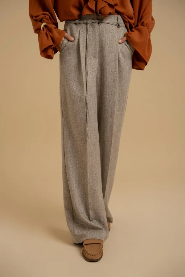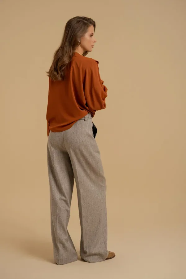 Брюки женские прямого силуэта со стрелками из костюмной ткани. Пояс - отрезной с эластичной тесьмой и застежкой на брючный крючок. В боковых швах - карманы с отрезными бочками. В размерах 44-50 есть складки в области талии. Брюки декорированы поясом в виде шнурка из основной ткани. Есть шлевки для ремня.