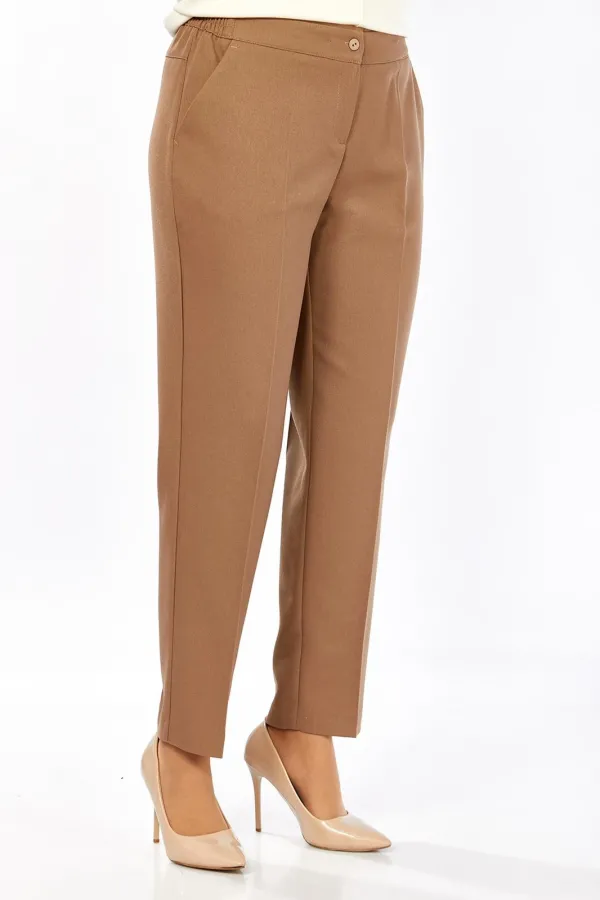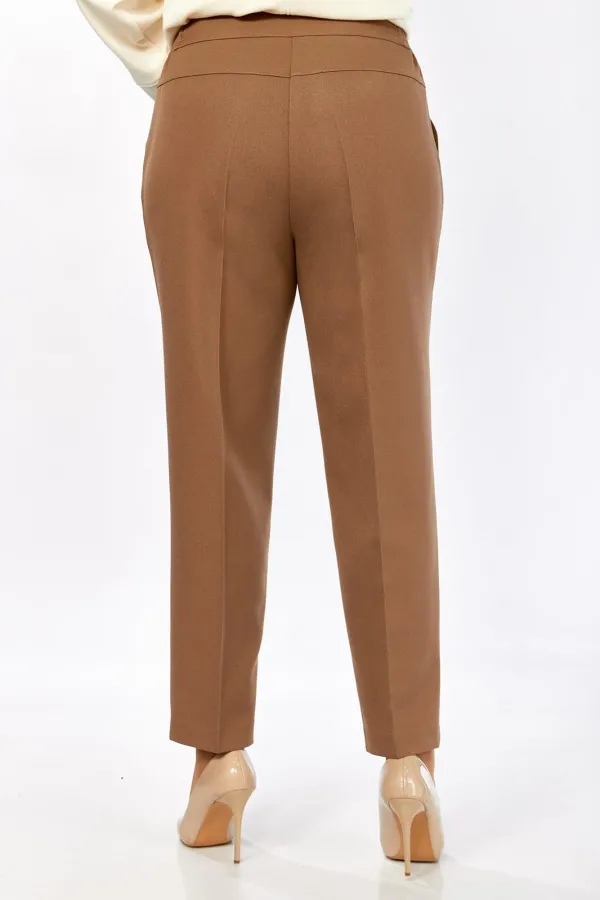 Брюки женские классические из костюмной ткани. В брюках обработан пояс, частично на резинке. Застежка на молнию, петлю и пуговицу. В брюках обработаны боковые карманы. На задней части брюк — кокетка.