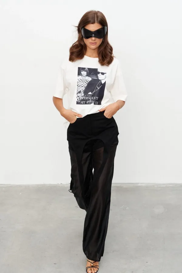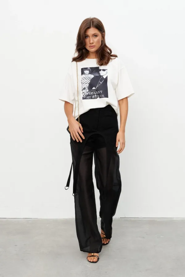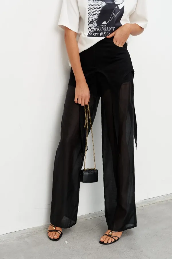 Брюки прямого силуэта с баской выполнены на сочетании плотного джинса и полупрозрачной вискозной вуали. Брюки на поясе со шлёвками и застёжкой на пуговицу-болт и молнию. Чуть ниже шва сидения идут подрезы имитирующие по форме мини-шорты. От подрезов вниз брюки выполнены из вуали. По переду два прорезных кармана, по спинке - два накладных.