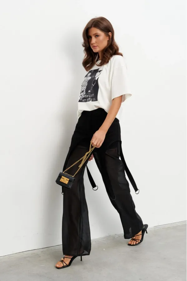 Брюки прямого силуэта с баской выполнены на сочетании плотного джинса и полупрозрачной вискозной вуали. Брюки на поясе со шлёвками и застёжкой на пуговицу-болт и молнию. Чуть ниже шва сидения идут подрезы имитирующие по ... Читать далее...