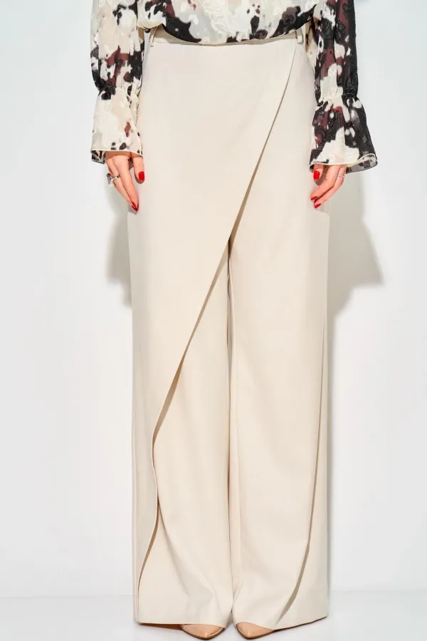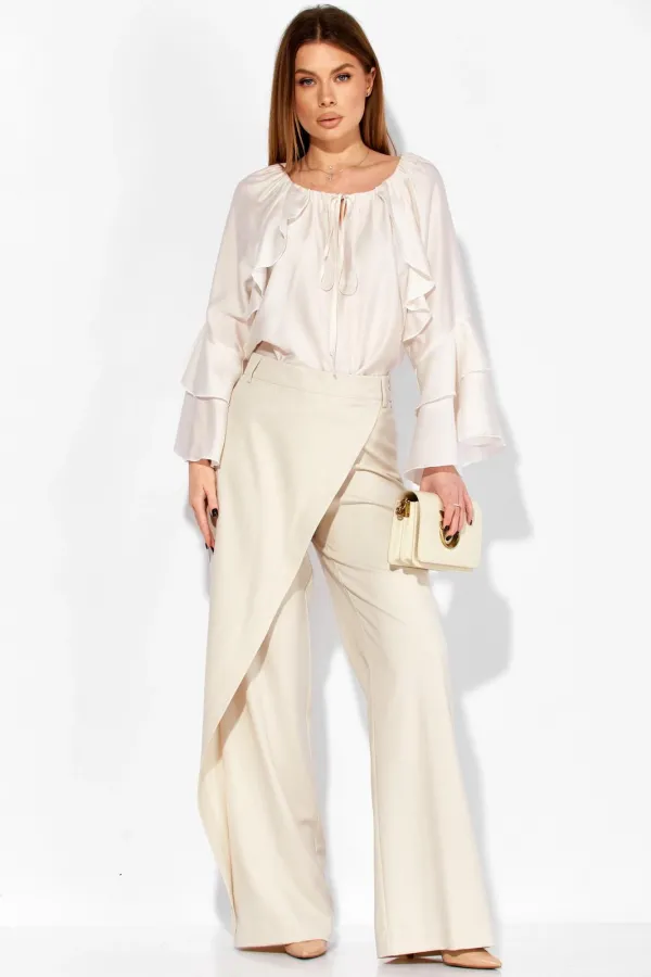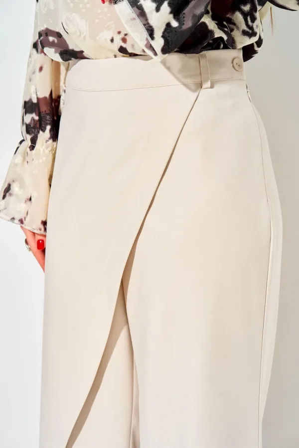 Брюки идеально подчеркивают фигуру, плотно облегая верхнюю часть и плавно переходя в прямой крой к низу. Уникальный элемент — элегантный запах, который добавляет нотку изысканности и утонченности. Пояс-кокетка обеспечивает комфорт благодаря вставленной эластичной тесьме на спинке. Застежка на потайную молнию в левом боковом шве и петлю-пуговицу. Вытачки на задних частях обеспечивают идеальную посадку, а шлёвки на поясе позволяют легко дополнить образ стильным ремнем.