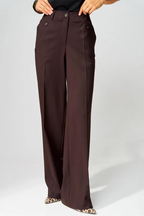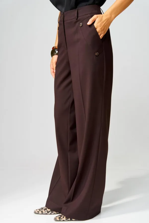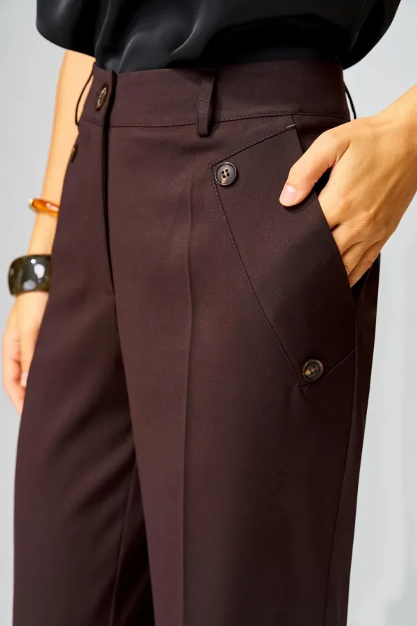 Брюки плотно облегают вверху и расширенные к низу, с притачным поясом-кокеткой со шлевками. Застежка на тесьму-молнию и 1 петлю и пуговицу. На передних частях брюк в боковых швах обработаны наклонные карманы с широкими листочками с втачными концами, на которых декоративно прикреплены по 2 пуговицы. На задних частях брюк обработаны вытачки. На передних половинках брюк заутюжены канты.