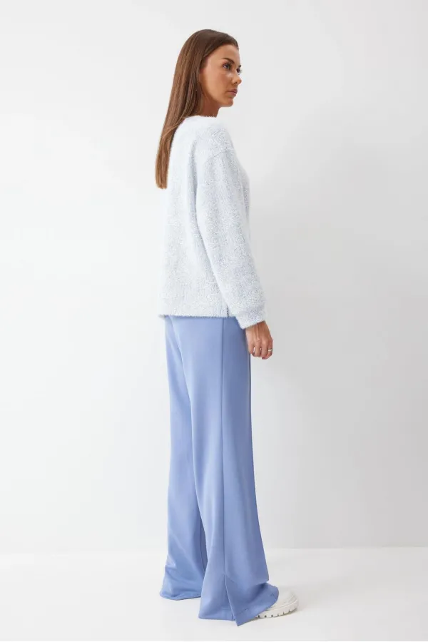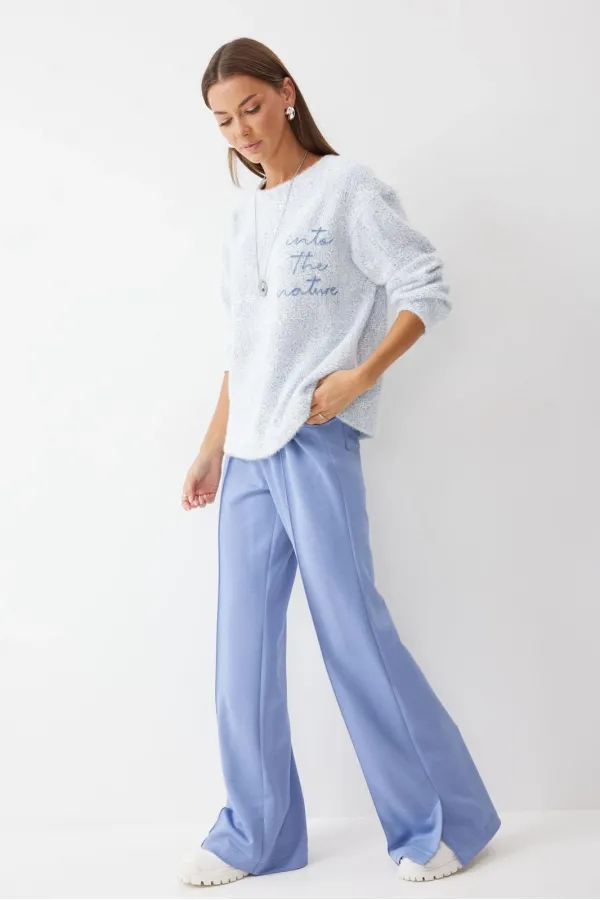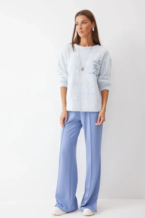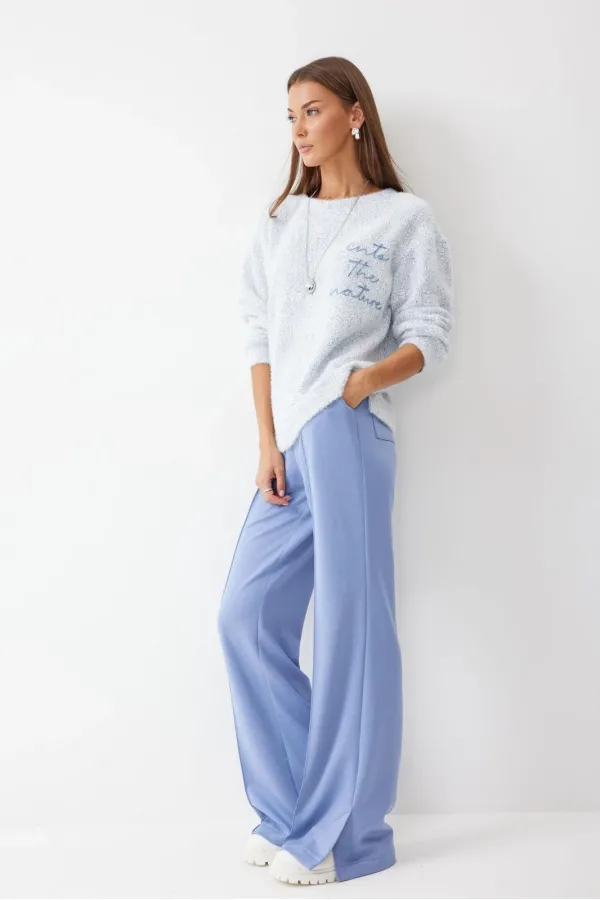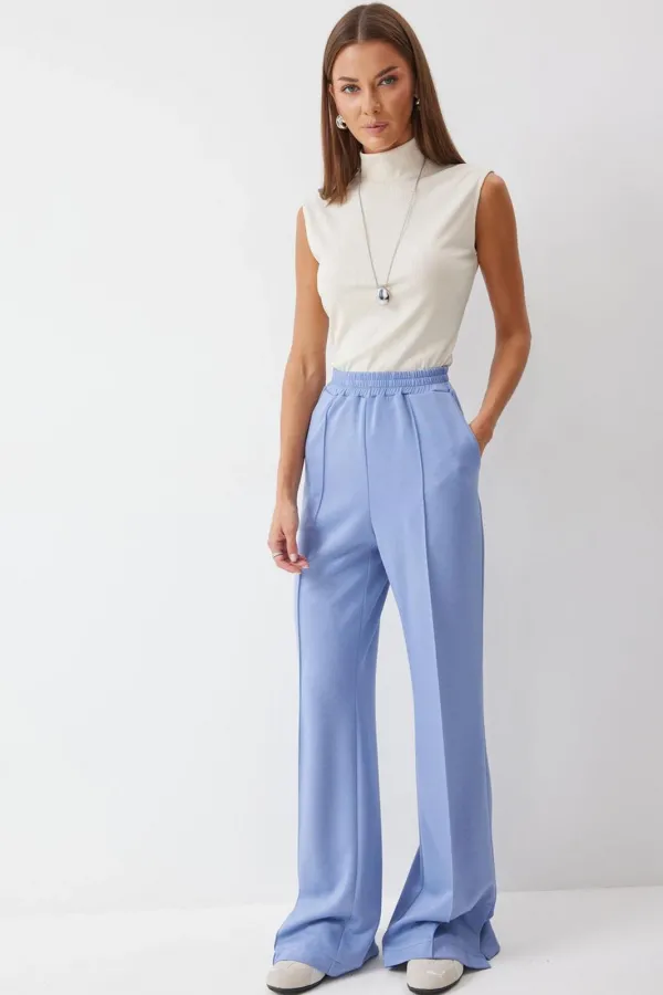 Брюки прямого силуэта из трикотажного полотна. По верху брюк притачной пояс на резинке. На передних половинках брюк обработаны карманы и защипы. На задних – карманы. По низу внешнего шва брюк шлицы.