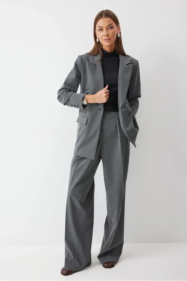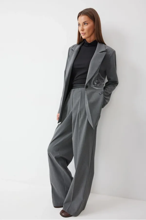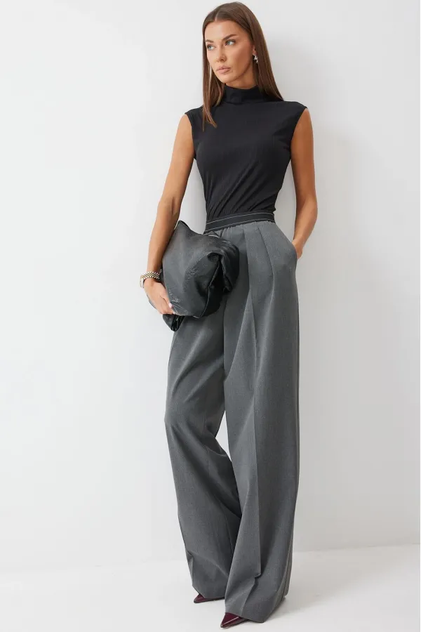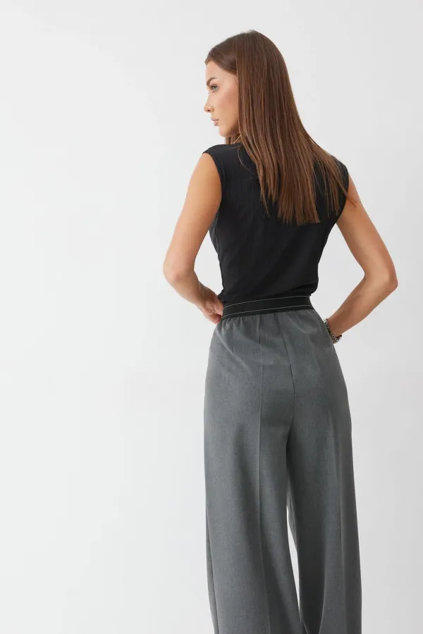 Брюки прямого силуэта из костюмной ткани. По верху брюк декоративная резинка. На передних половинках карманы и декоративные складки. На задних половинках вытачки. Обращаем ваше внимание, что фурнитура может отличаться от фото.