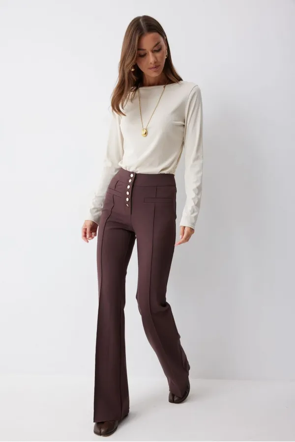 Брюки прямого силуэта с защипами из трикотажного полотна. По верху брюк притачной пояс и центральная застежка на петли и пуговицы. На передних половинках защипы и декоративные листочки. На задних половинках брюк накладные карманы. Обращаем ваше внимание, что фурнитура может отличаться от фото.