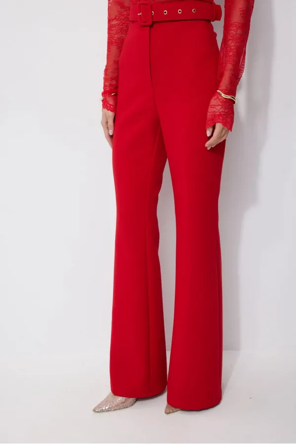 Брюки прилегающего силуэта расширенные книзу из костюмной ткани. По верху притачной пояс с застежкой на петлю и пуговицу и шлевками для ремня. На передних половинках обработана застежка молния в среднем шве. В комплект входит съемный ремень. Обращаем ваше внимание, что фурнитура может отличаться от фото.