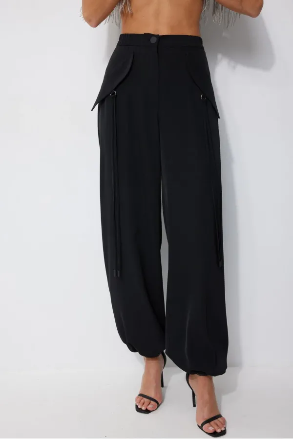 Брюки свободного силуэта из струящейся ткани. По верху брюк притачной пояс с застежкой на петлю и пуговицу. На передних половинках обработана застежка молния в среднем шве. На передних половинках декоративные клапаны. По поясу задних половинок брюк резинка и вытачки. Обращаем ваше внимание, что фурнитура может отличаться от фото.