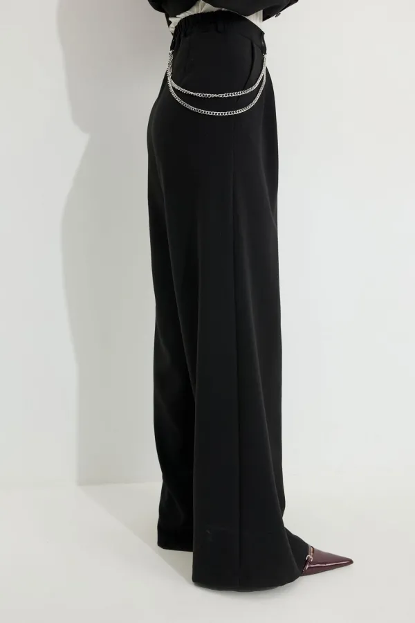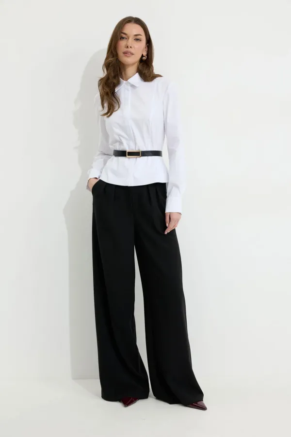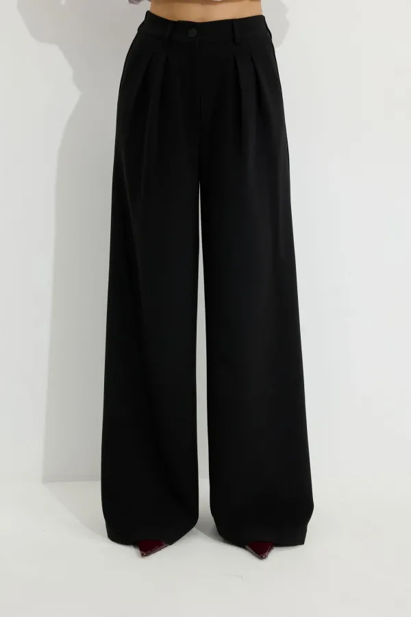 Брюки из поливискозной ткани, прямого, расширенного силуэта. На передних половинах брюк по две складки, выходящих из-под пояса, складки застрочены на несколько сантиметров. По переду застежка на молнию по типу гульфик. Брюки по переду с карманами в отрезных бочках. Пояс по переду с застежкой на петлю и пуговицу. Со шлевками по переду и спинке. По спинке в пояс вставлена резинка. На задних половинах брюк вытачки. Обращаем Ваше внимание, что фурнитура может незначительно отличаться от фото.