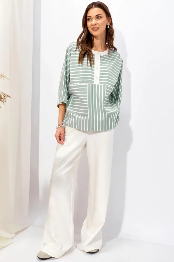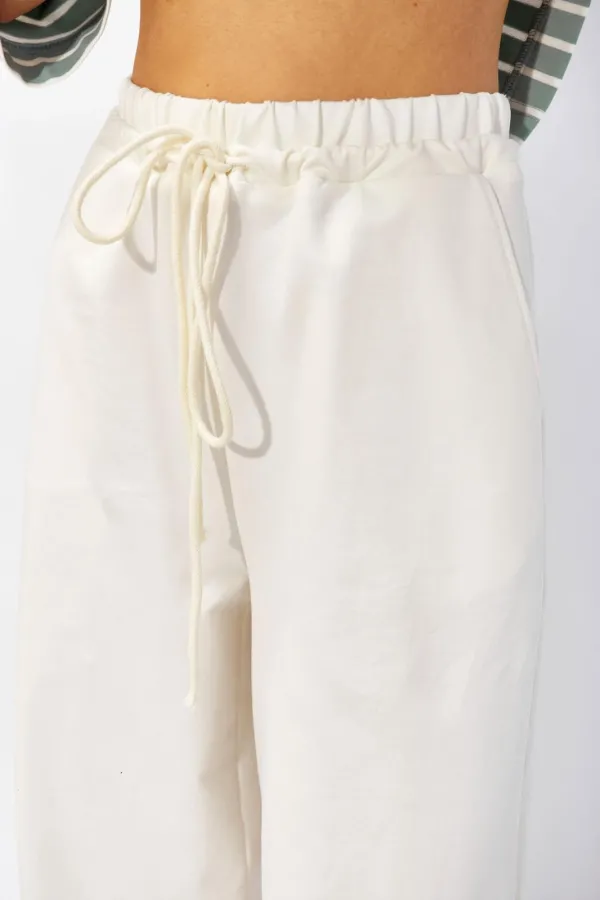 Брюки свободного прямого кроя, расширенные к низу. Выполнены из хлопкового трикотажного полотна молочного цвета. Пояс на резинке, с дополнительной кулисой и шнурком-завязкой. В брюках обработаны боковые карманы с наклонным входом . Обращаем ваше внимание, что фурнитура может отличаться от фото.