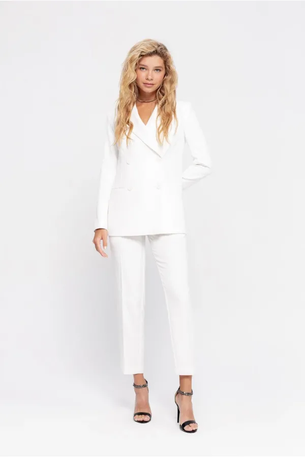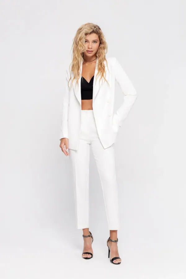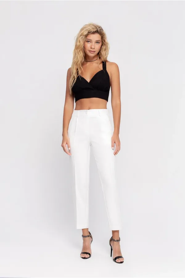 Классические укороченные брюки из текстильной ткани. Детали: брюки со средней посадкой, притачной пояс со шлевками, передние половины с небольшими мягкими складками и заутюженными стрелками, застежка на молнию и пуговицу, боковые карманы.