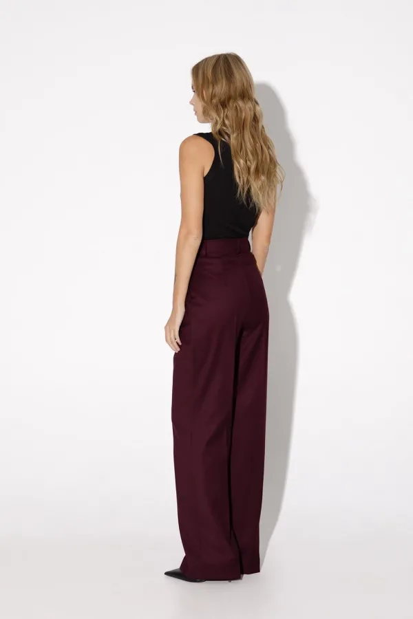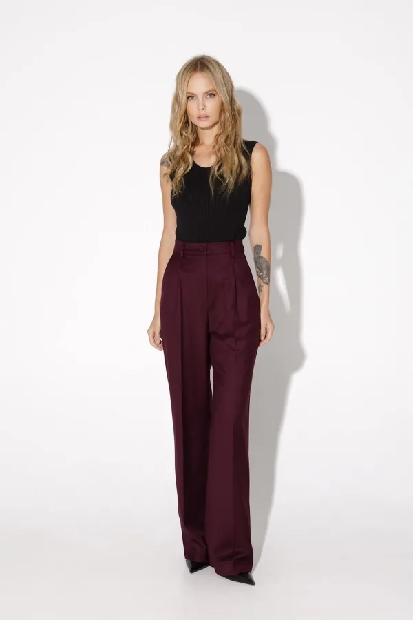 Текстильные брюки-палаццо с высокой посадкой. Детали: высокая посадка, широкие и длинные брюки, притачной пояс со шлевками, передние половины с небольшими застроченными мягкими складками и заутюженными стрелками, застежка на молнию и пуговицу, боковые карманы