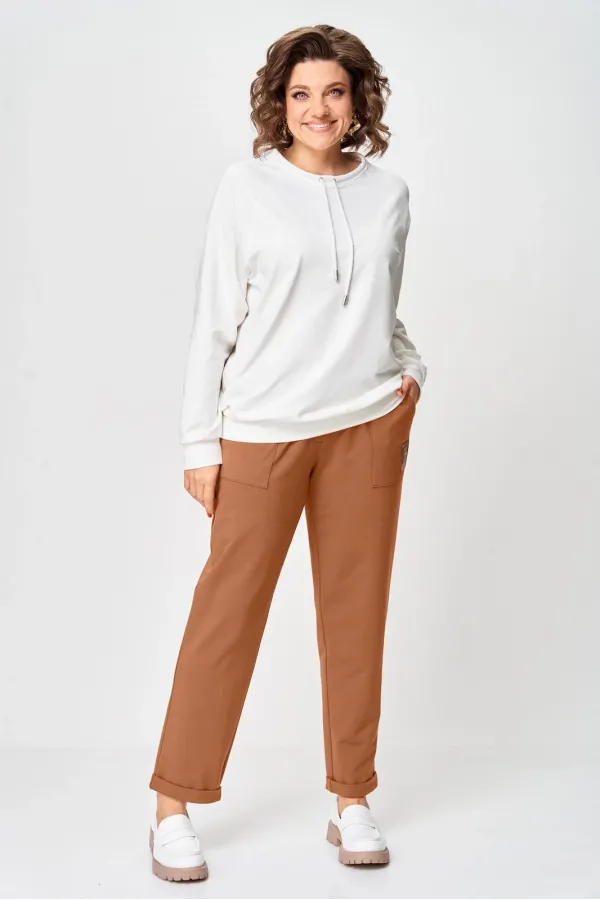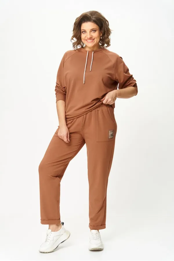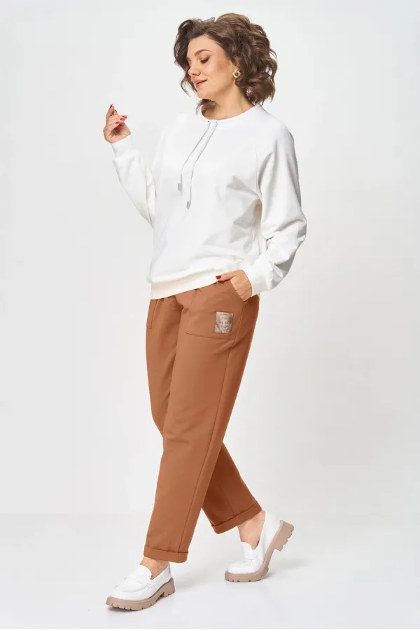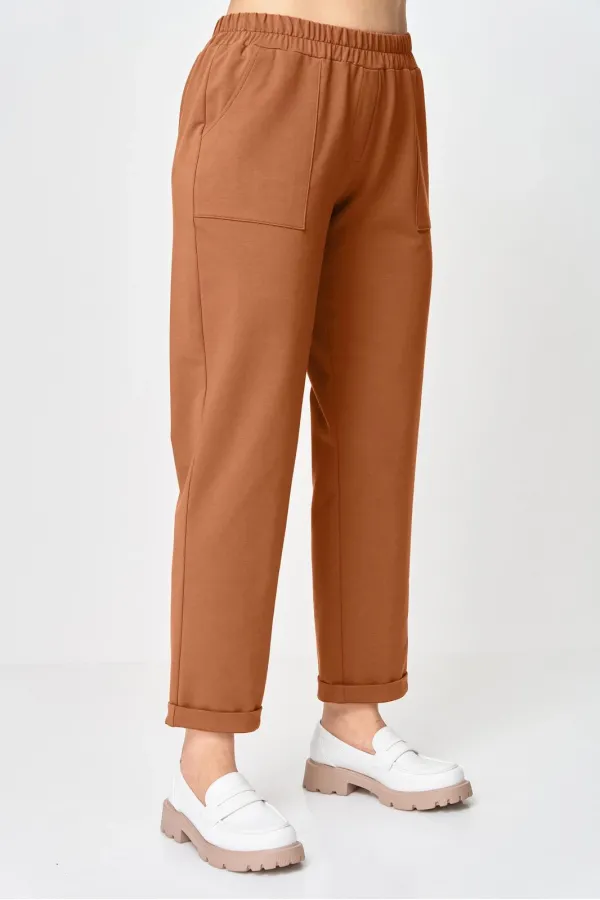 Брюки женские из трикотажной ткани (двунитка), слегка заужены к низу. По переду брюк расположены накладные карманы. На левом кармане настрочной декоративный элемент. В пояс вставлена резинка по кругу.