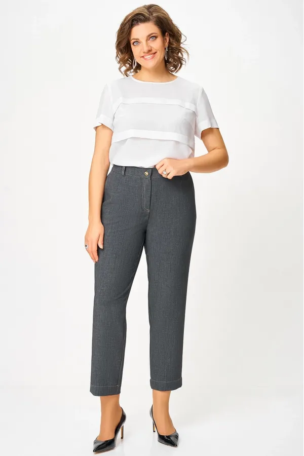 Брюки из мягкой эластичной ткани под джинс, прямого силуэта, заужены к низу. Спереди боковые функциональные карманы, сзади накладные фигурные карманы с двойной контрастной отстрочкой. Пояс притачной с эластичной тесьмой-резинкой по спинке и шлёвками для пояса. Застёжка на тесьму-молнию, петлю и джинсовую пуговицу на поясе.