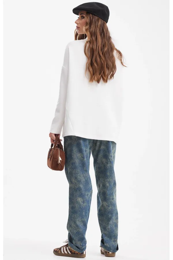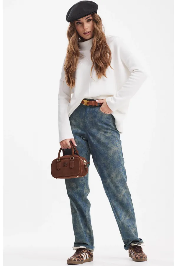 Брюки прямые из джинсовой ткани. Верх на притачном поясе со шлевками. Застежка по переду на молнию и пуговицу на поясе. На переде боковые карманы. На задних частях кокетка и карманы. На заднем кармане выполнена вышивка.