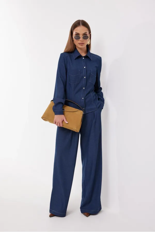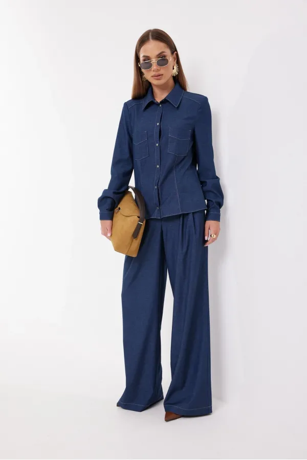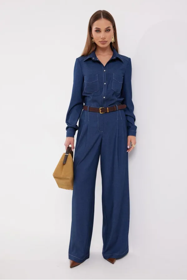 Брюки прямые из костюмной ткани. Верх на поясе со шлевками. Ширинка на молнии и удлиненный пояс со скрытой застежкой на пуговицу и крючок. На передних половинках брюк по две односторонние складки , диагональные боковые карманы.