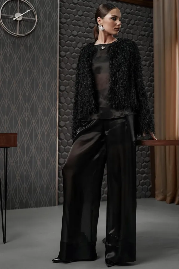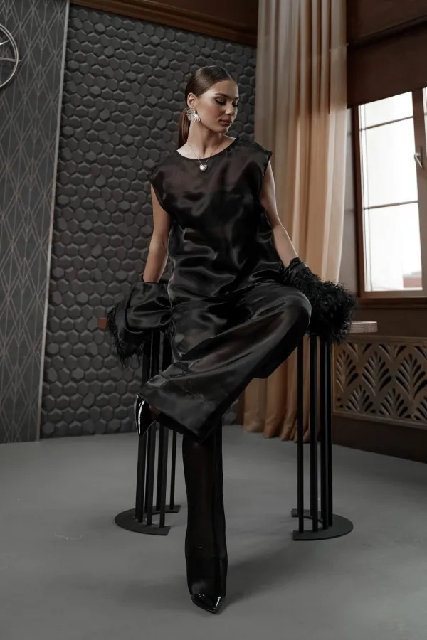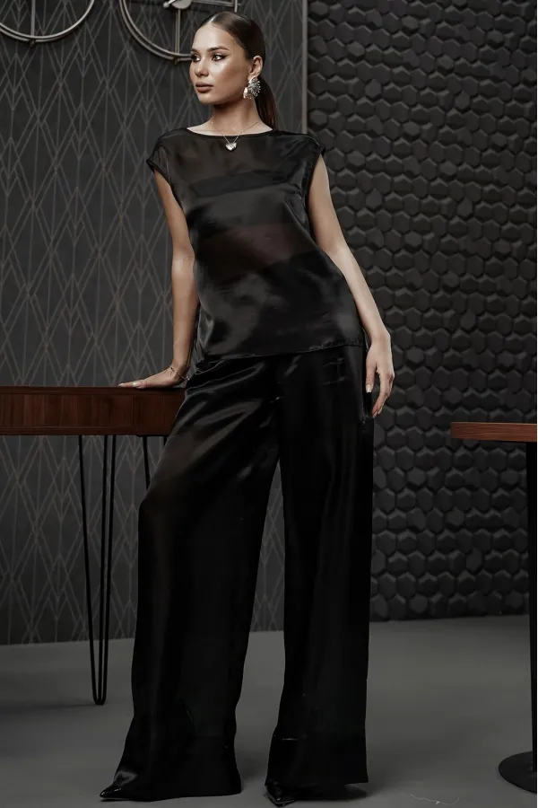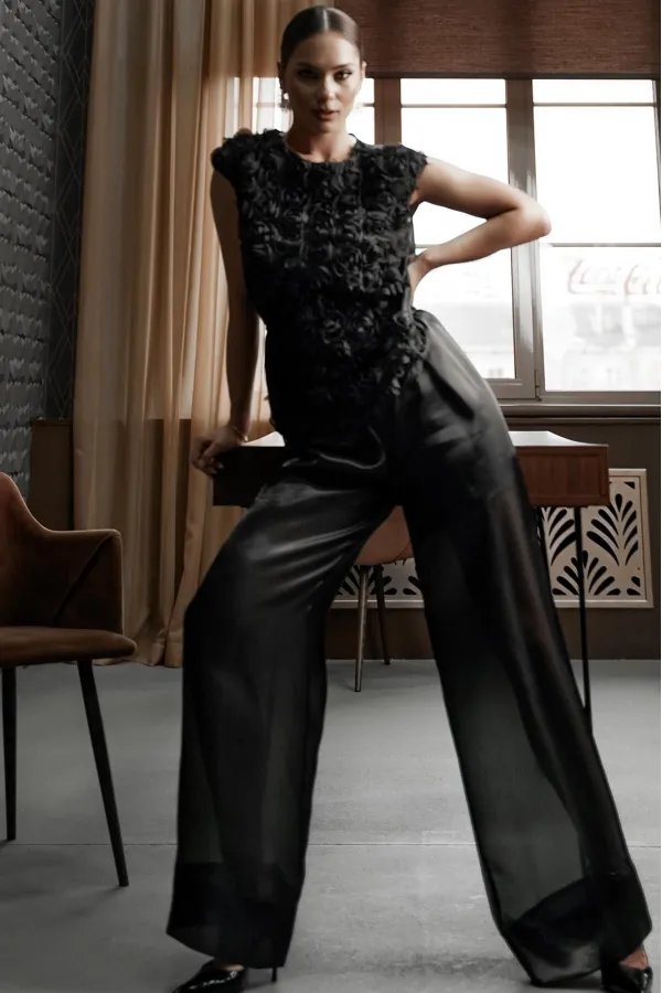 Брюки из нарядной полупрозрачной ткани «органза», прямые, широкие. Средняя посадка, пояс притачной, застежка спереди на молнию и декоративную пуговицу. Брюки с глубокими складками по переду. Брюки на подкладке в виде шорт.
