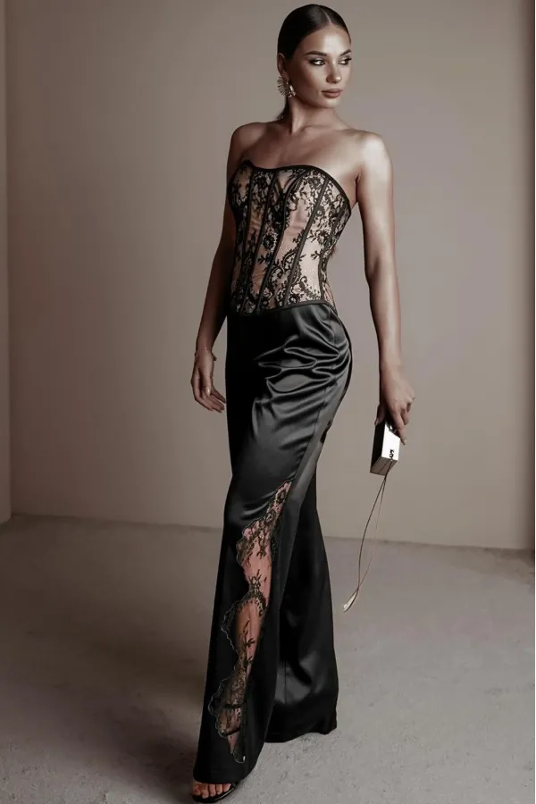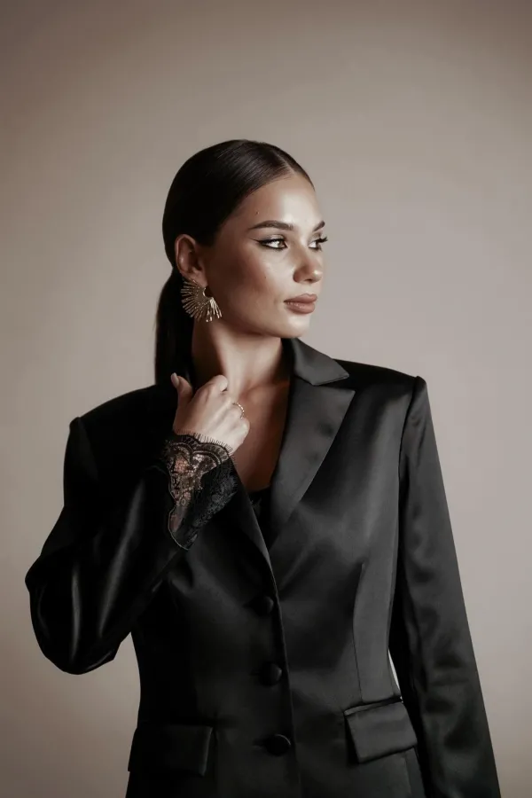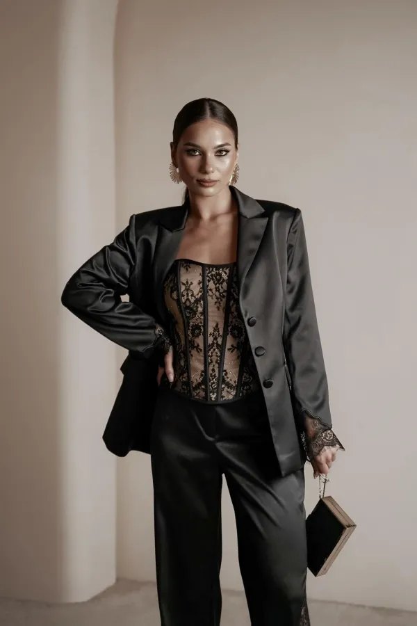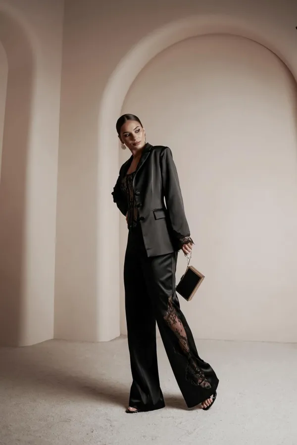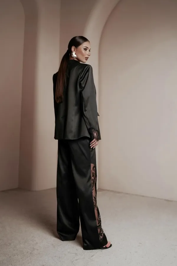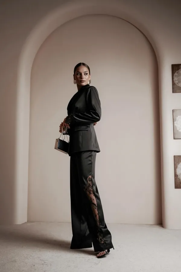 Брюки прямые из атласной ткани. По передним половинкам ближе к боковому шву – вышивка с кружевом.