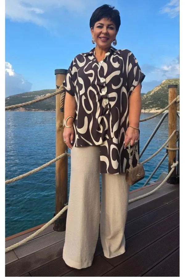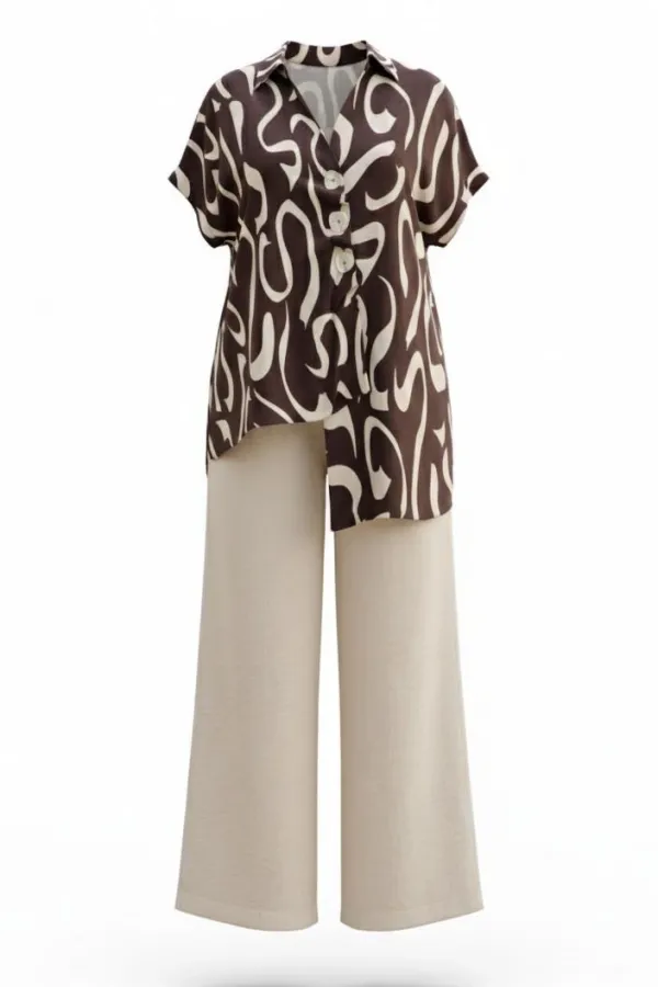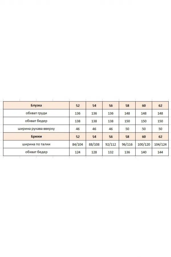 Брюки не обтягивают — они оформляют. Они создают вертикаль, которая: визуально вытягивает силуэт — делая его стройнее, балансируют с объёмом блузки — создавая гармонию, позволяют ногам дышать — даже в самую жару, дают свободу шага — широкого, уверенного. Брюки прямого силуэта, с притачным поясом со вставкой эластичной тесьмы-резинки в бочках, застёжкой на тесьму-молнию в гульфике и пуговицу в поясе. В боковых швах брюк прорезные карманы. Длина блузки 69 см (р 52-56), 72 см (р 58-62). Длина брюк 108 см.Подробные замеры смотрите на дополнительном фото. Подходит на рост 164-170.