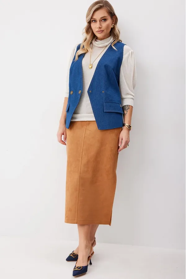 Жилет женский из джинсовой ткани на частичной подкладке. На передних половинках нагрудные вытачки и пропезные карманы с клапаном. Перед на подкладке, линия борта углом. Спинка с плечевыми вытачками имеет вырез по центру,... Читать далее...