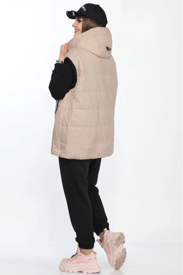 Модный жилет свободного силуэта с капюшоном на стойке из курточной ткани, уникальный бельгийский утеплитель «Isosoft» 100 г. на метр кв.,на ветрозащитной мембранной подкладке «Barrier». По полочкам прорезные карманы. Низ жилета на регулируемой кулисе. Застежка декор. молния.
