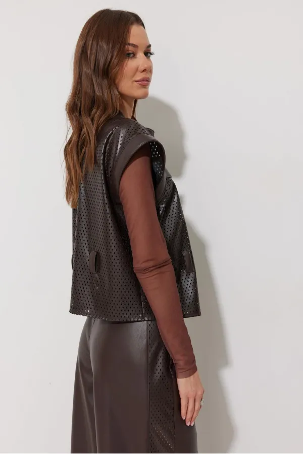 Жилет прямого силуэта из экокожи с перфорацией. Горловина-стойка, по переду застежка на кнопки. Жилет со спущенной линией плеча и отделочными манжетами. По переду кокетка с декоративными клапанами и шлевками для ремня. ... Читать далее...