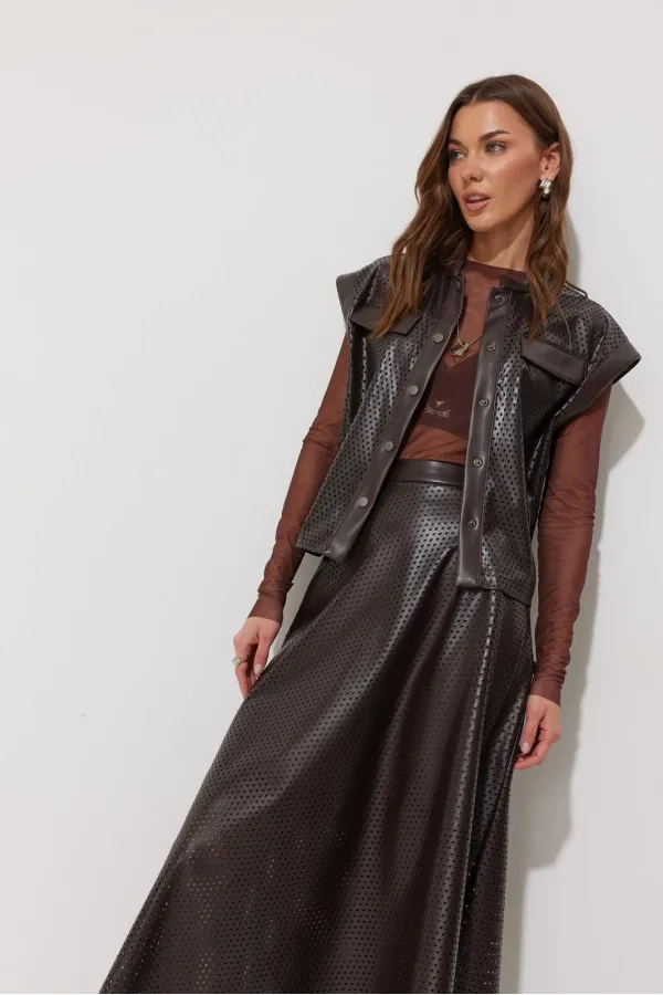 Жилет прямого силуэта из экокожи с перфорацией. Горловина-стойка, по переду застежка на кнопки. Жилет со спущенной линией плеча и отделочными манжетами. По переду кокетка с декоративными клапанами и шлевками для ремня. В комплект входит съемный ремень. Обращаем ваше внимание, что фурнитура может отличаться от фото.