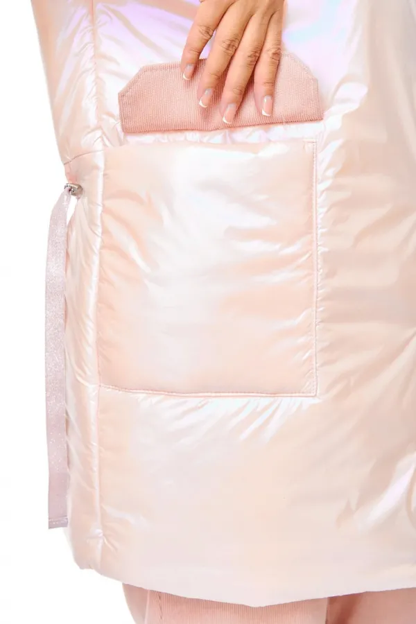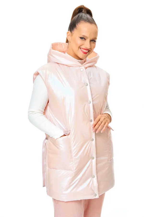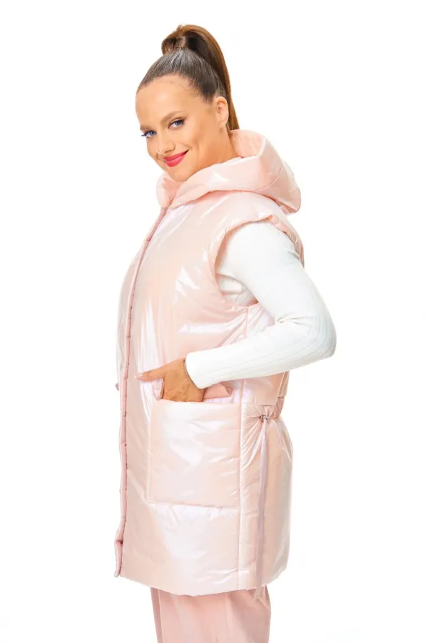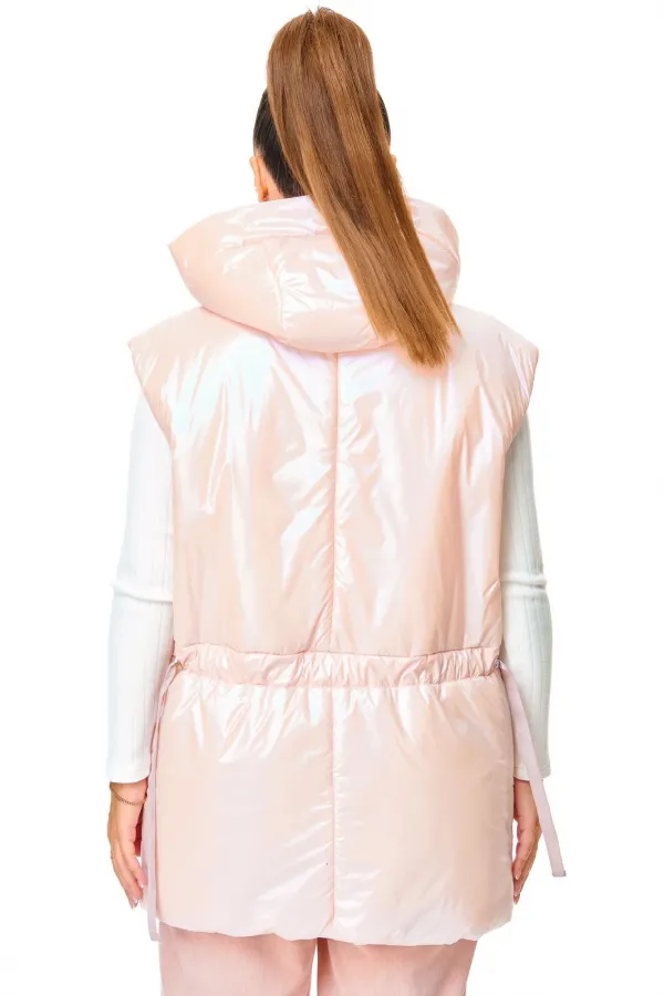 Удлиненный жилет с глубоким капюшоном на легком утеплителе синтепон. Застежка на кнопки. По переду накладные карманы с клапаном. Низ затягивается на кулиску. Жилет на подкладке.