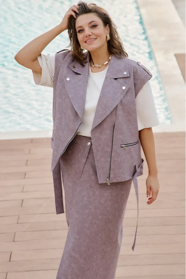 Жилет «оверсайз» силуэта, выполненный в стиле «косуха», удлинённый. Воротник пиджачного типа с отделкой декоративными кнопками по лацканам; ассиметричным бортом и застёжкой на тесьму молнию. По переду жилета декоративный... Читать далее...