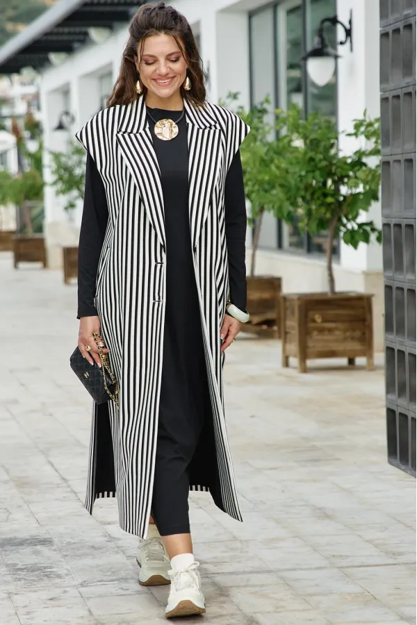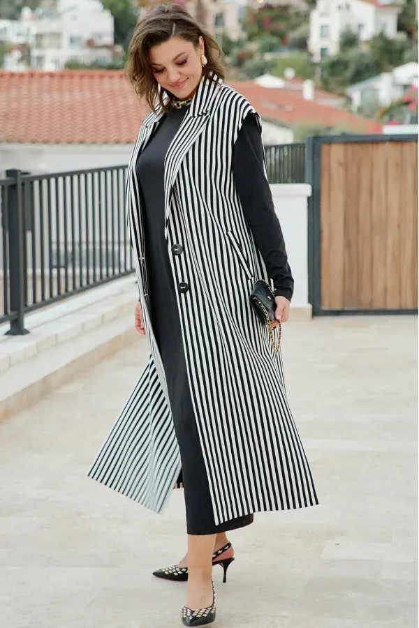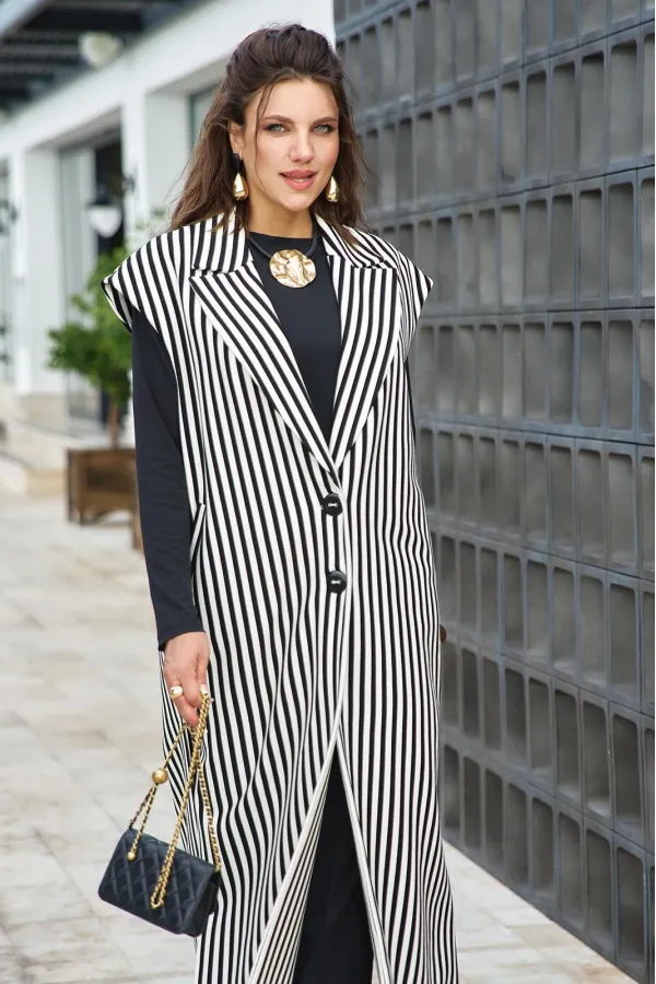 Как отдельная единица гардероба жилет миди в чёрно‑белую полоску — это минимализм с характером: он диктует ритм, задаёт форму и оставляет место для вашей интерпретации. Чёрно‑белая полоска — не просто орнамент, а ритм. Вертикальные полосы удлиняют фигуру, горизонтальные — играют с пропорциями. Наденьте его — и мир уже реагирует на новый аккорд вашего стиля. Жилет прямого силуэта, длины «миди», свободный с отложным воротником пиджачного типа и застёжкой на декоративные пуговицы по борту. Линия плеча спущенная, в боковых швах высокие разрезы. По переду жилета прорезные карманы с листочкой. Спинка со средним швом. Жилет на подкладке. За счёт вертикальной полоски силуэт визуально вытягивается, делая образ более стройным. Длина жилета 124 см (р 50-54), 125 см (р 56-60), ширина плеча 21 см (р 50-54), 22 см (р 56-60).Подробные замеры смотрите на дополнительном фото. Подходит на рост 164-170.