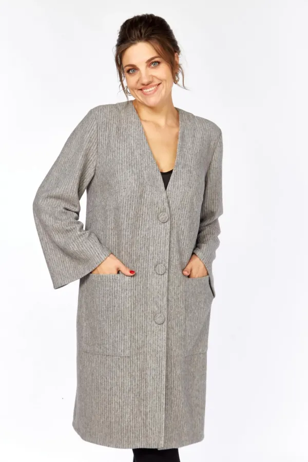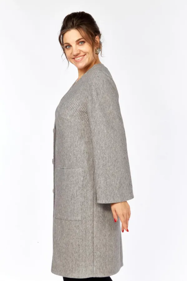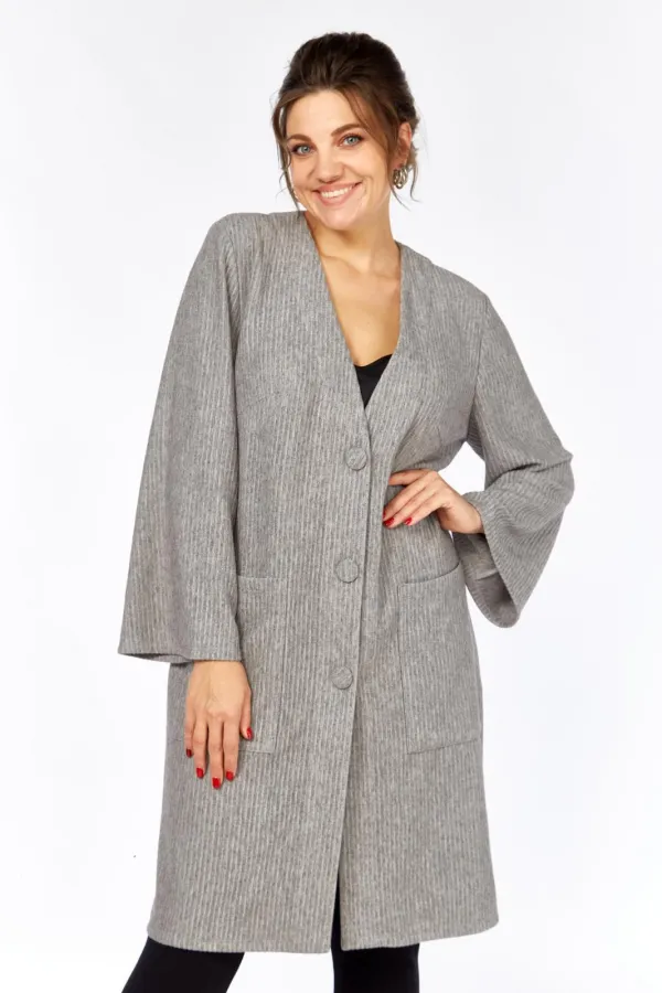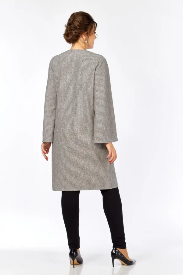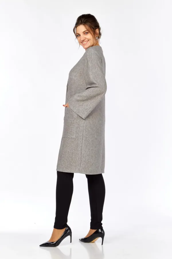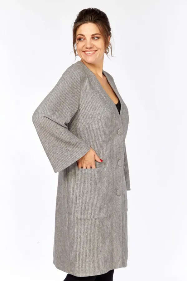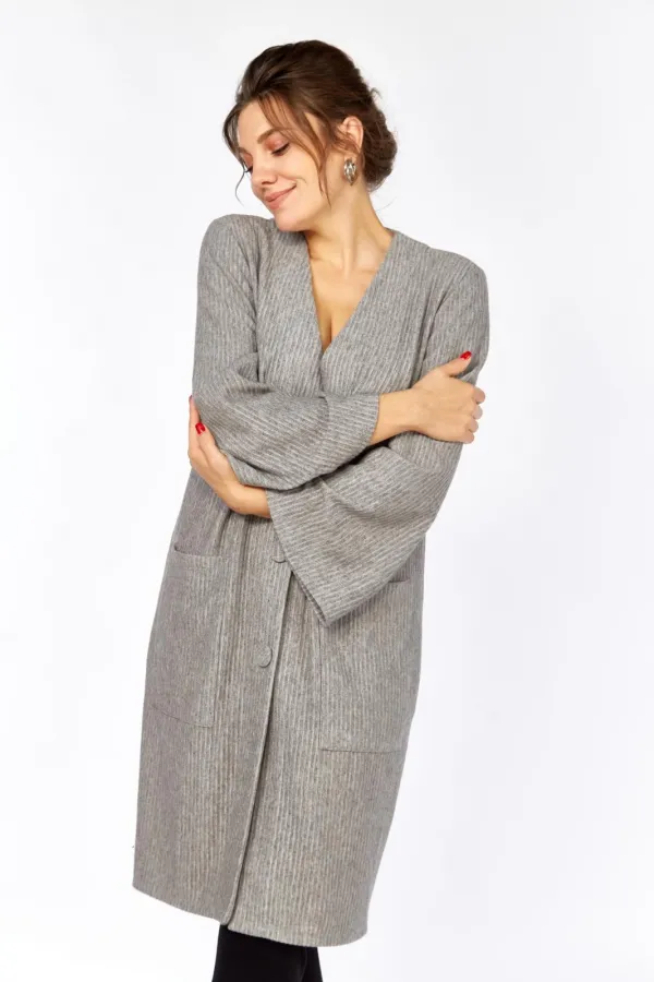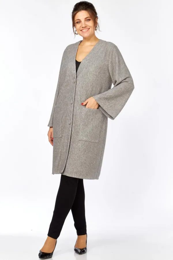 Кардиган прямого силуэта с длинным рукавом. Низ рукава расширенный к низу. Низ рукава и низ изделия обработан распошивалкой. По краю борта и горловинам переда и спинки обтачка. Застежка на петли и пуговицы. На переде накладные карманы. Длина по спинке(от пересечения плеча и шеи)-107см, длина рукава-61см.Параметры модели: обхват груди-98см, обхват бедер-110см, размер изделия на модели 50.