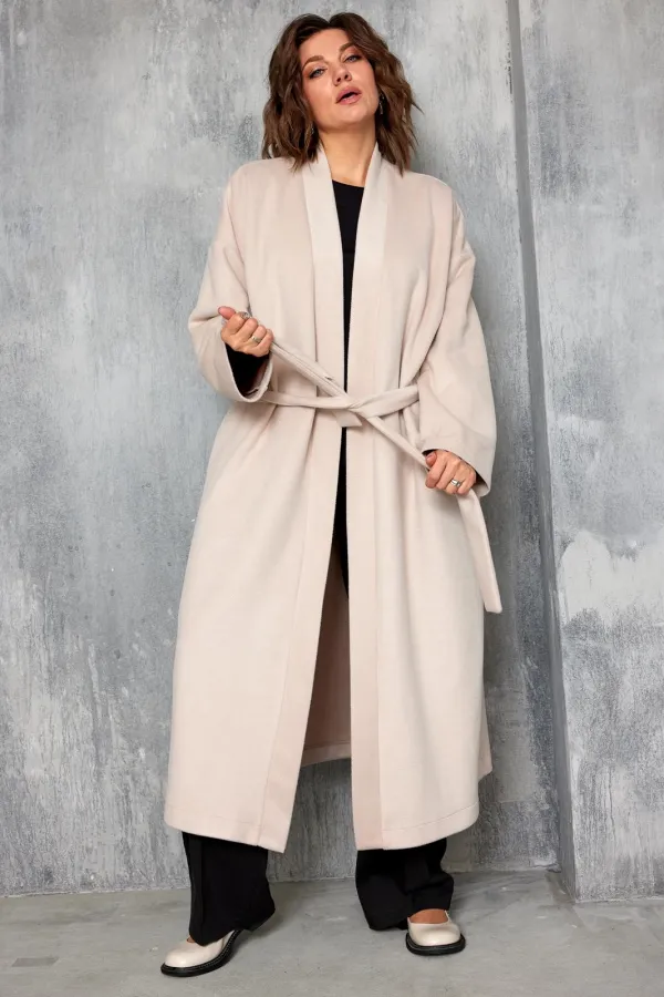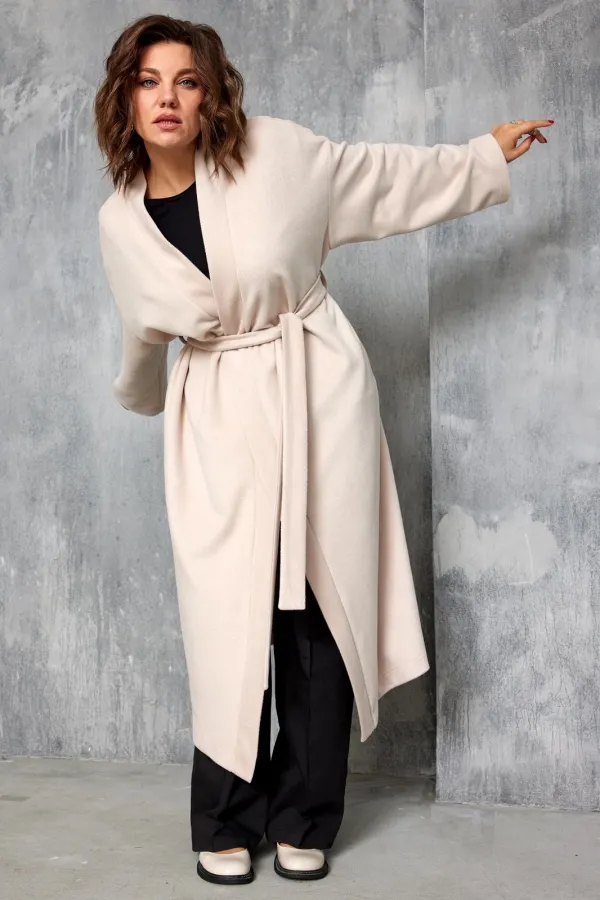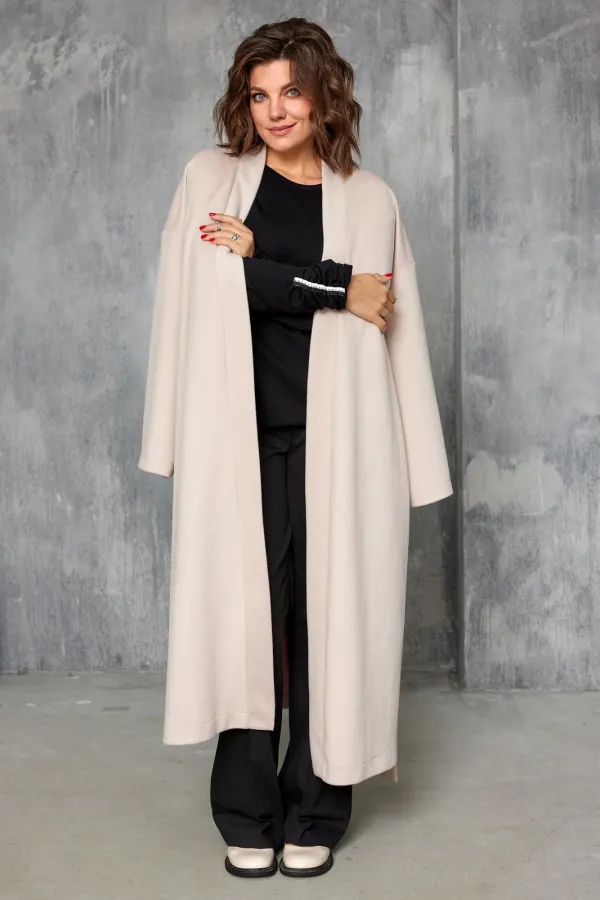 Рукав со спущенной проймой. В районе талии шлёвки для фиксации пояса. В комплекте съёмный пояс. Низ кардигана обработан в подгибку.