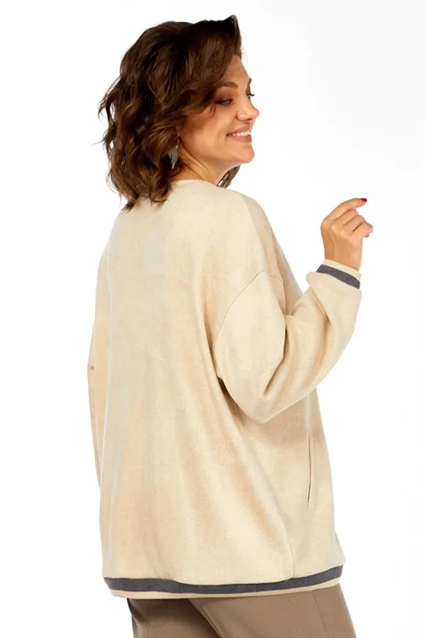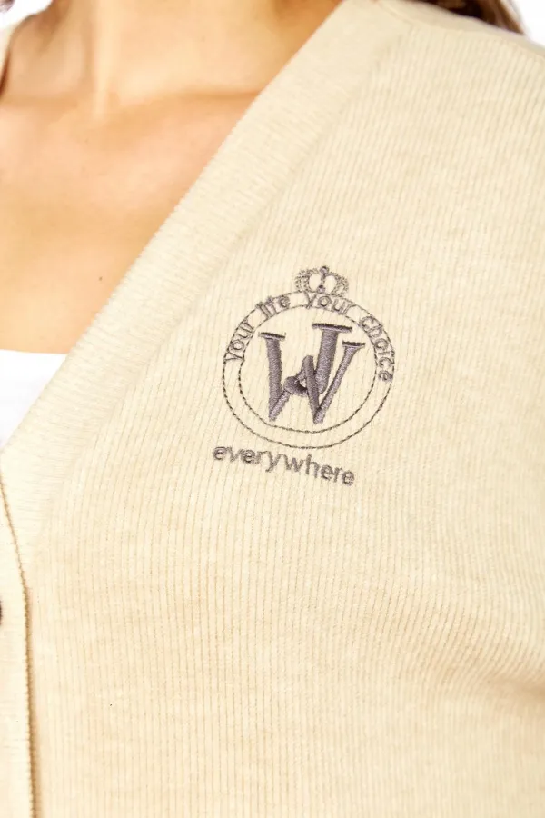 Кардиган женский, изготовлен из трикотажного полотна. Горловина V-образной формы, застежка отрезная планка на петли и пуговицы. Карманы с листочками. По низу изделия и низу рукавов-декоративные довязы. Спинка цельнокроенная. Рукава спущенные длинные. Отделочный элемент — вышивка на детали переда.
