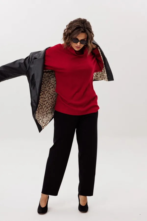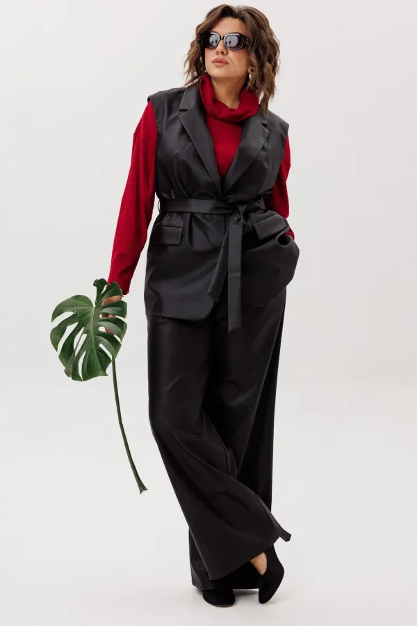 На модели трикотажные брюки 1660.1, брюки из эко кожи 1400.2, жакет 1470 и жилет 1502.1.Размер 52: ОГ-124; ОБ-128; ОП-48; ДИ-70; ДР-54; ШП-16,5;