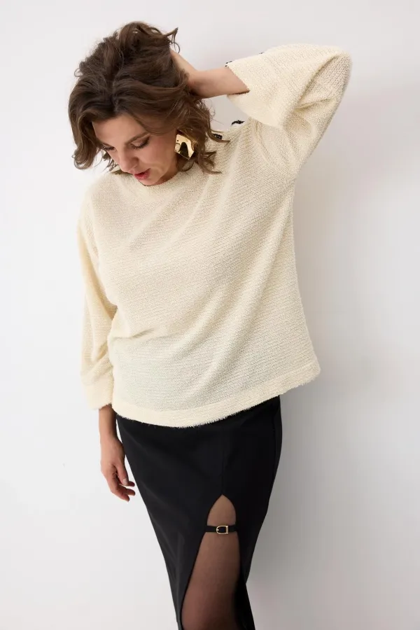 Нежный свитшот свободного кроя из фактурного трикотажа с вплетением мерцающих нитей в благородном оттенке топлёного молока - идеальный выбор для уютных и элегантных образов. Модель идеально впишется в Ваш гардероб, позволяя создавать множество современных сочетаний с жакетами, брюками, юбками и различной обувью.