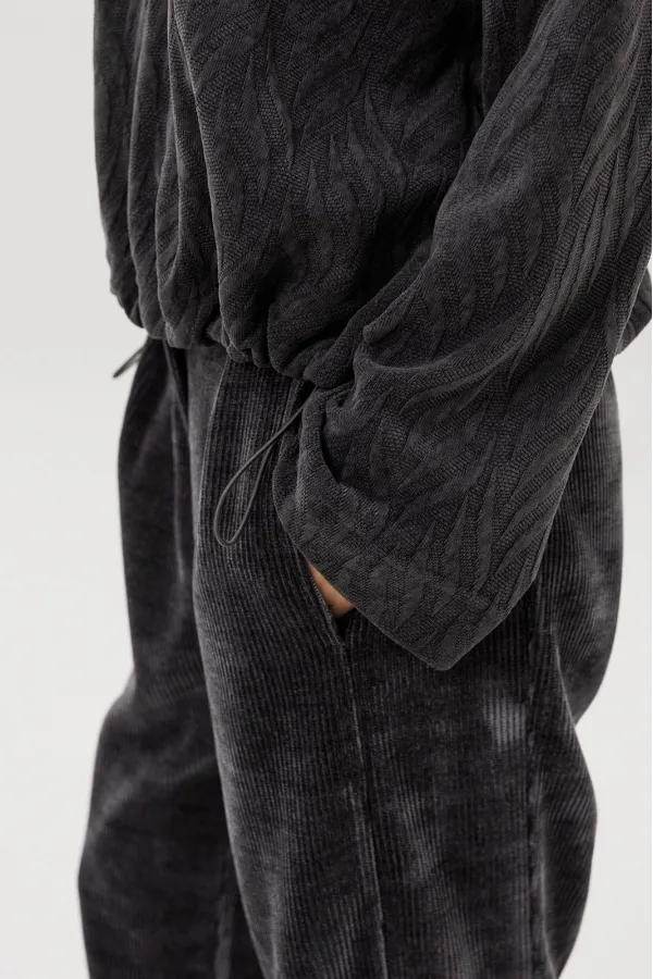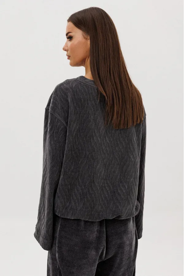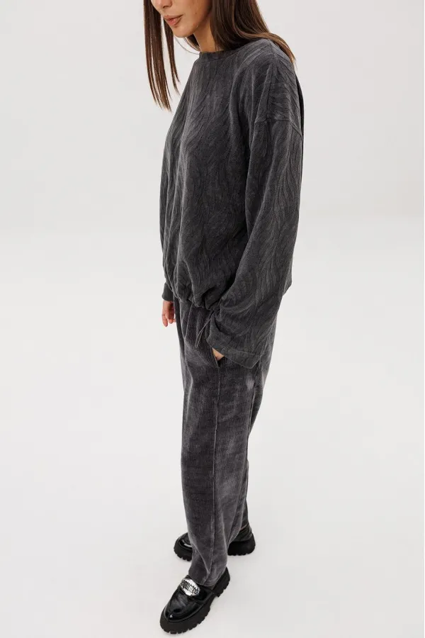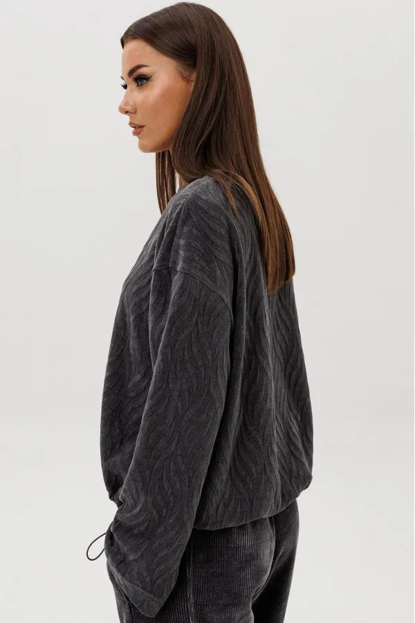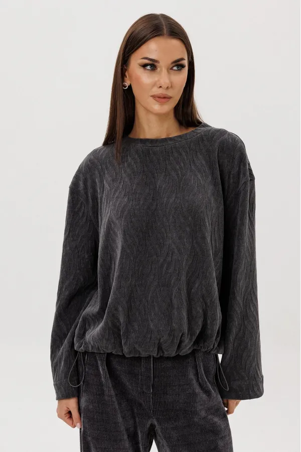 Свободный джемпер расширенного силуэта втачного покроя на заниженной линии плеча. Рукав расширенный в области оката. По низу джемпера шнур- резинка с фиксаторами.