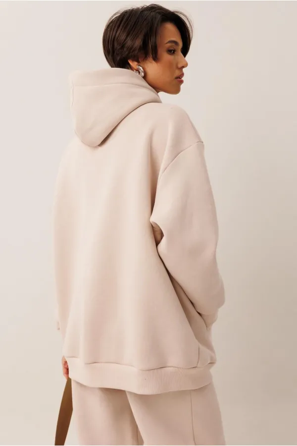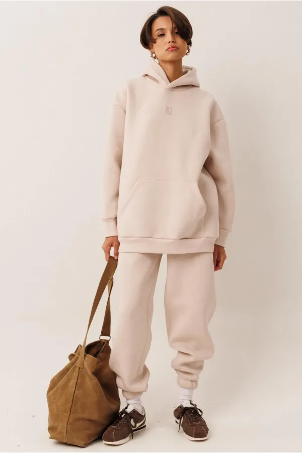 Женский тёплый уютный костюм. Подойдет для прогулок и отдыха. Изготовлен из футера с начесом, состоит из худи, покроя оверсайз и джоггеров.