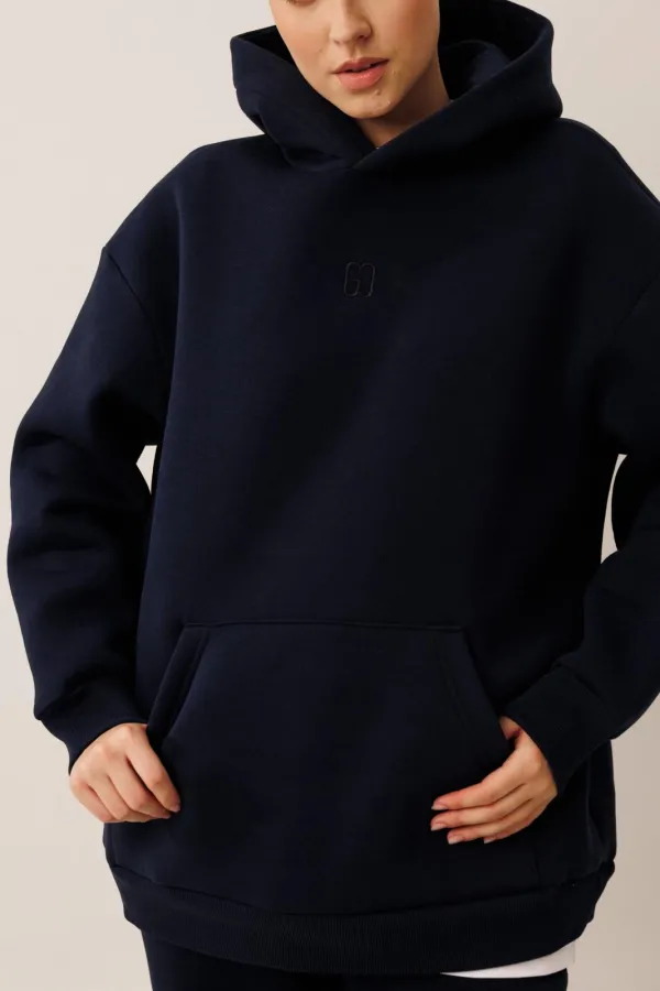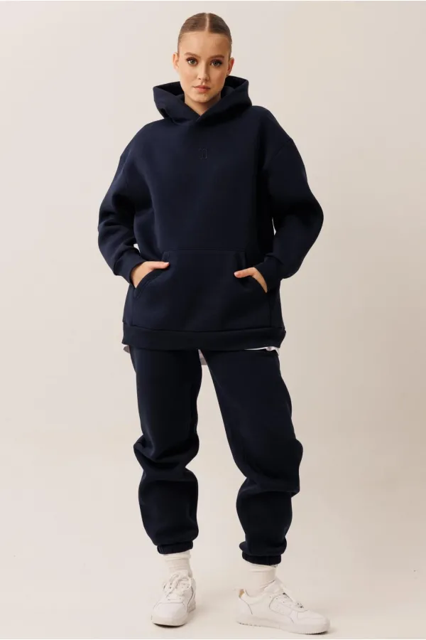Женский тёплый уютный костюм. Подойдет для прогулок и отдыха. Изготовлен из футера с начесом, состоит из худи, покроя оверсайз и джоггеров. Худи имеет двойной капюшон и карман кенгуру. По центру переда вышивка-логотип в ... Читать далее...