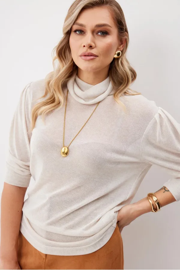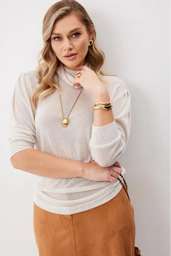 Блуза женская прямого силуэта из трикотажной ткани длиной ниже линии бедра. Горловина обработана отложной стойкой. Рукав ¾ втачной одношовный. По верху рукава заложены складки, по низу рукава притачная манжета.