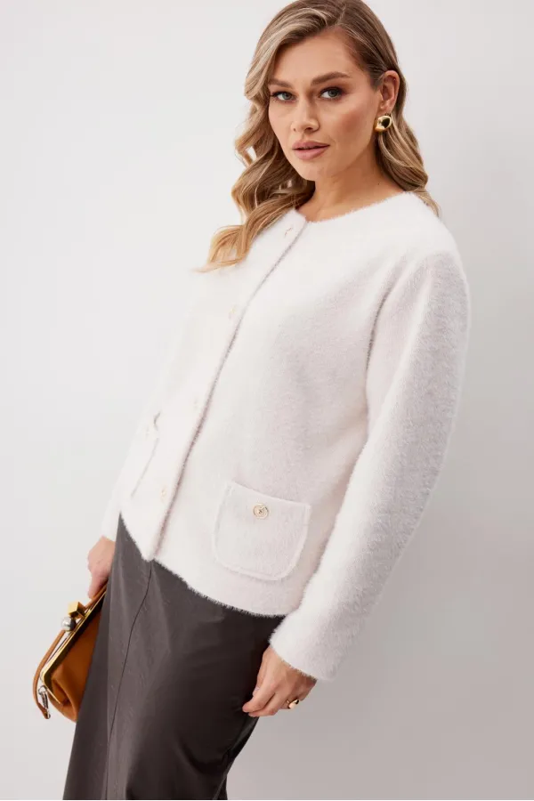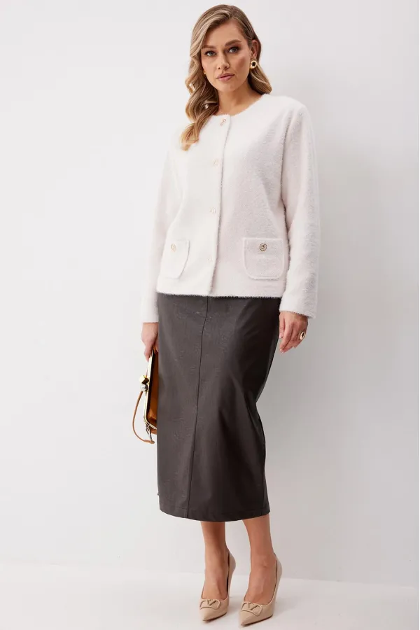 Жакет женский из трикотажной ткани прямого силуэта на подкладке. На деталях переда настрочены накладные карманы округлой формы застегивающиеся на декоративные кнопки. Спинка прямая. Рукав двухшовный с имитацией шлицы. Горловина округлой формы. Жакет застегивается на декоративные кнопки.