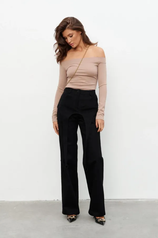 Джемпер из трикотажного полотна прилегающего силуэта с открытыми плечами. Отрезная деталь по верху изделия плотно фиксирует изделие на фигуре.