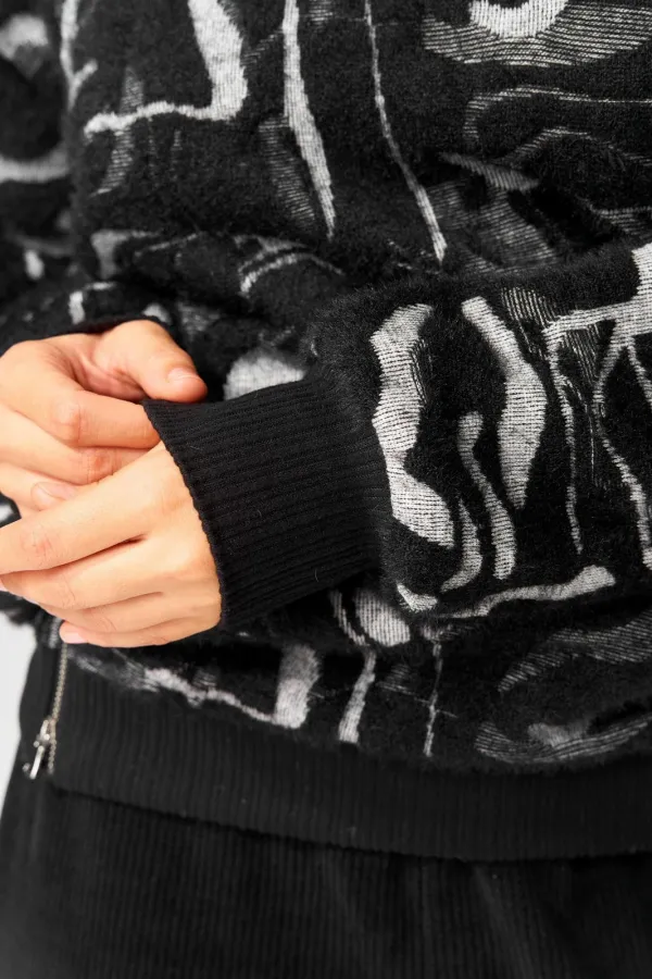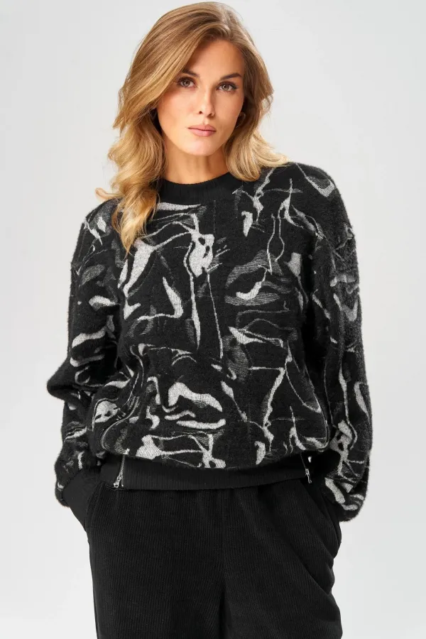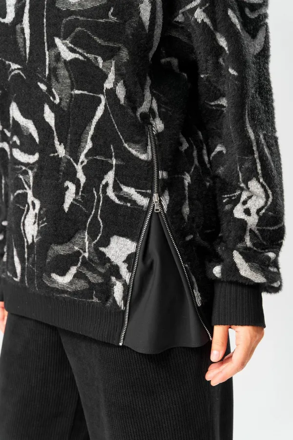 Вырез горловины округлой формы, с втачной бейкой. Детали переда с рельефными швами, которые заканчиваются застежкой на функциональную тесьму-молнию и с вставкой из декоративной ткани. Молнии позволяют регулировать ширину и длину изделия. Джемпер со спущенной линией плеча, рукава втачные одношовные с притачными манжетами.