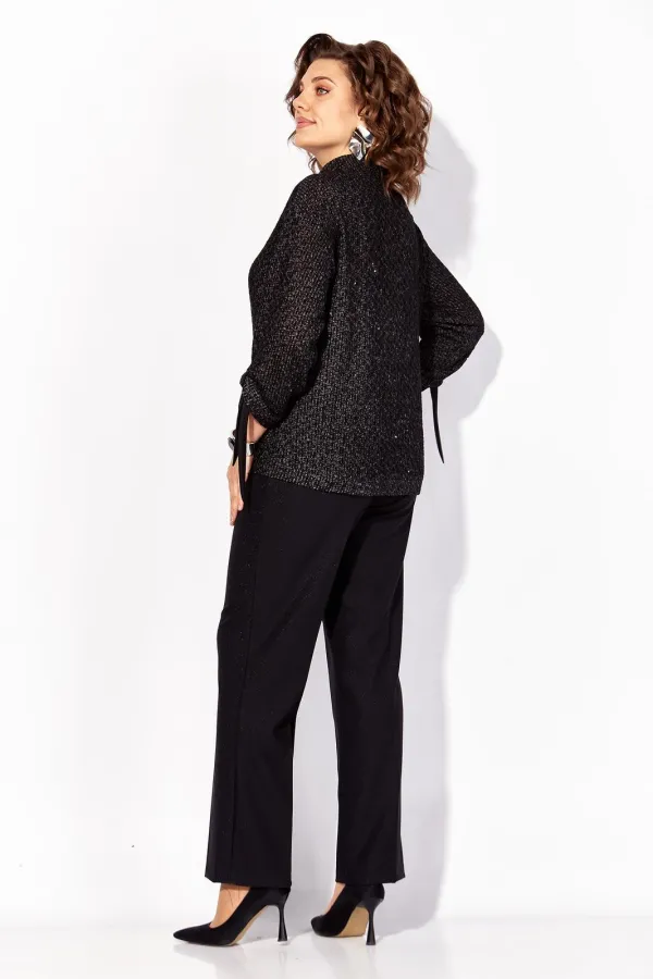 Эффектный, нарядный облегченный жакет, выполнен из вязанного трикотажа с эффектом легкого мерцания. Модель свободного силуэта, с рукавом длиной ¾-ти на спущенном плечевом поясе. Горловина обработана полулежащей стойкой. Застежка центральная на молнию. По полочке расположены аккуратные накладные карманы. Низ изделия оформлен притачной планкой. Изюминкой данной моделям служит необычные паты по рукаву с завязкой в виде банта.