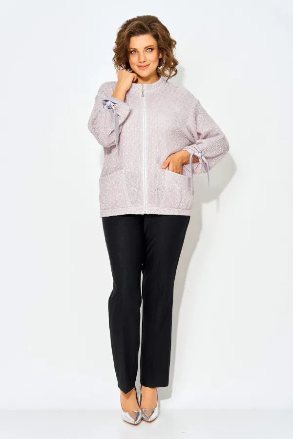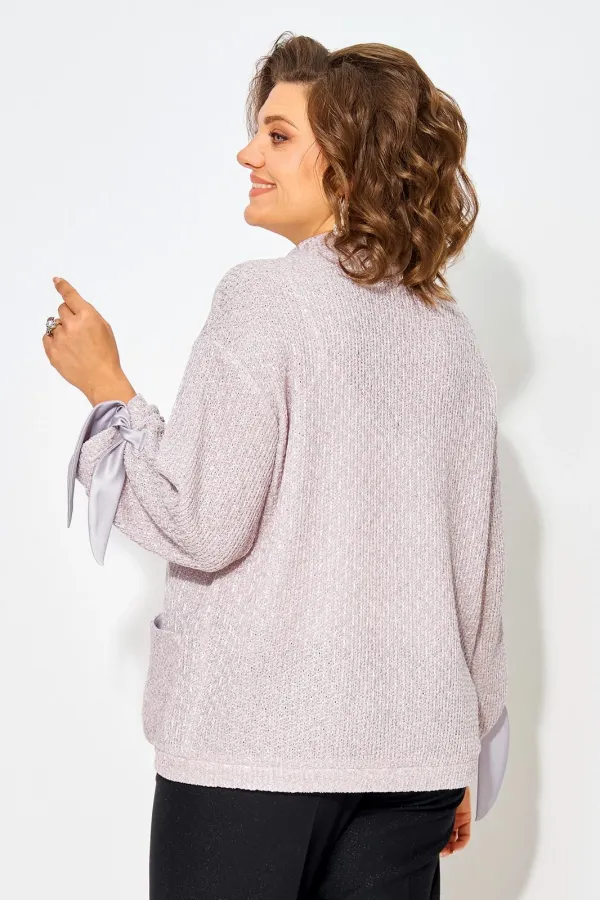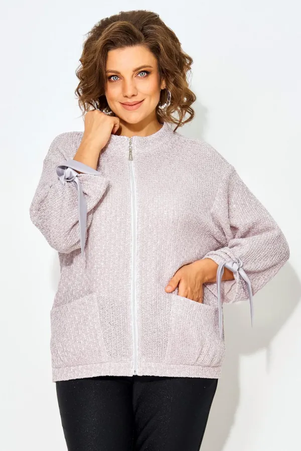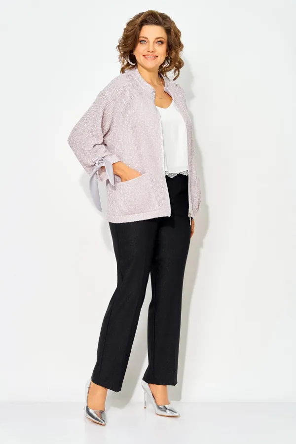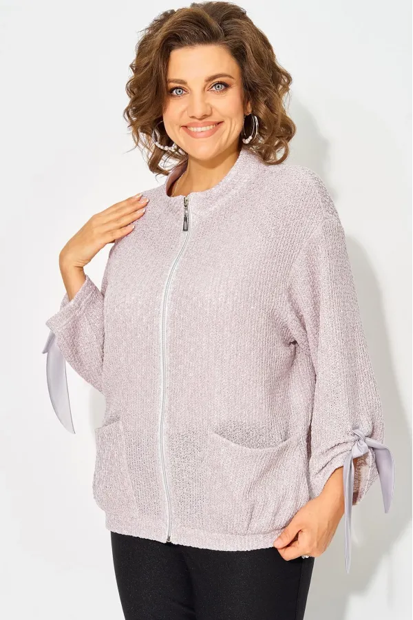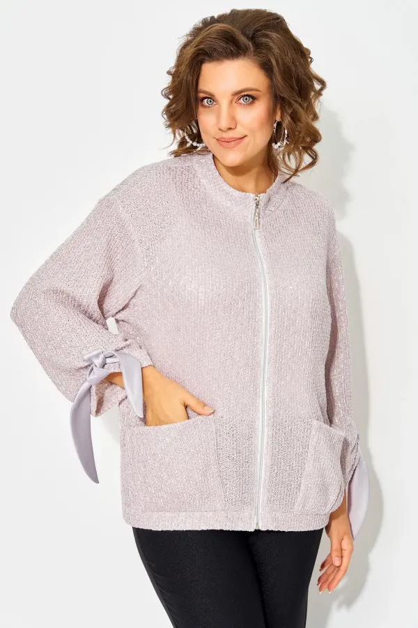 Эффектный, нарядный облегченный жакет, выполнен из вязанного трикотажа с эффектом легкого мерцания. Модель свободного силуэта, с рукавом длиной ¾-ти на спущенном плечевом поясе. Горловина обработана полулежащей стойкой. Застежка центральная на молнию. По полочке расположены аккуратные накладные карманы. Низ изделия оформлен притачной планкой. Изюминкой данной моделям служит необычные паты по рукаву с завязкой в виде банта.