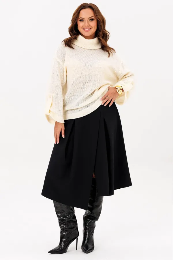 Джемпер изготовлен из вязаного трикотажа. Линия плеча спущена. Рукав длинный поддерживается патой на пуговицу. Воротник-хомут.