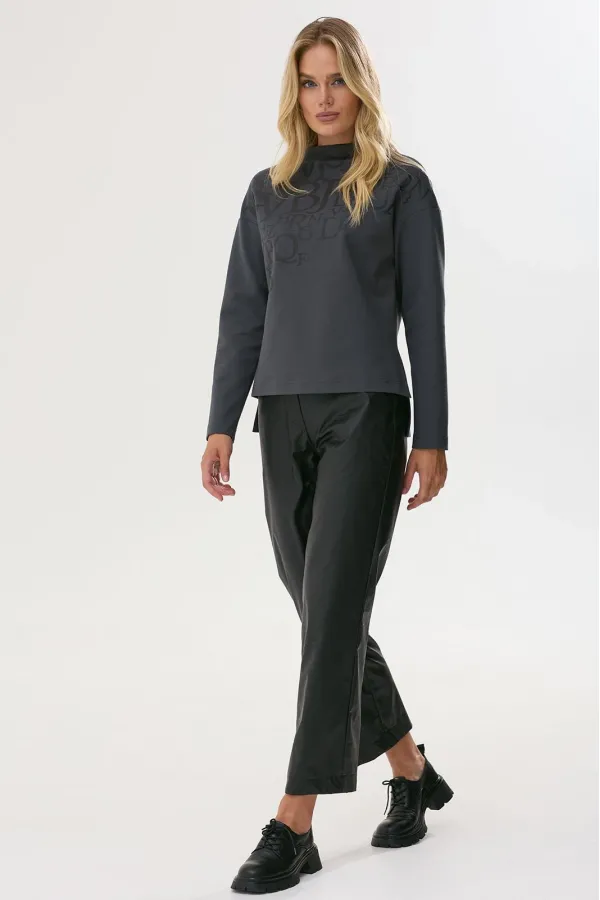 Стильный джемпер прямого силуэта из трикотажного полотна с удлиненной спинкой. Горловина- стойка цельнокроенная. Рукав со спущенной линией плеча длиной 7/8. В боковых швах декоративные разрезы. По переду дизайнерская печать.